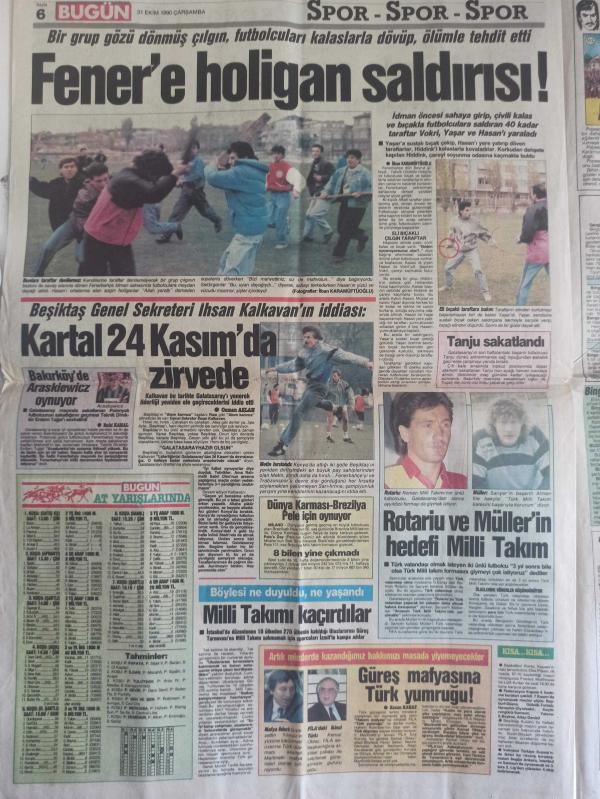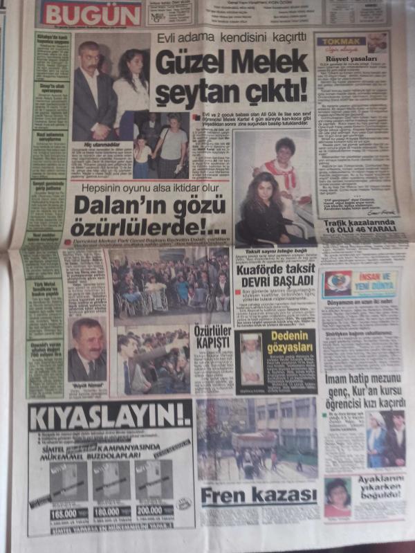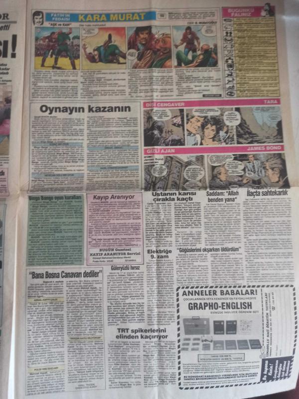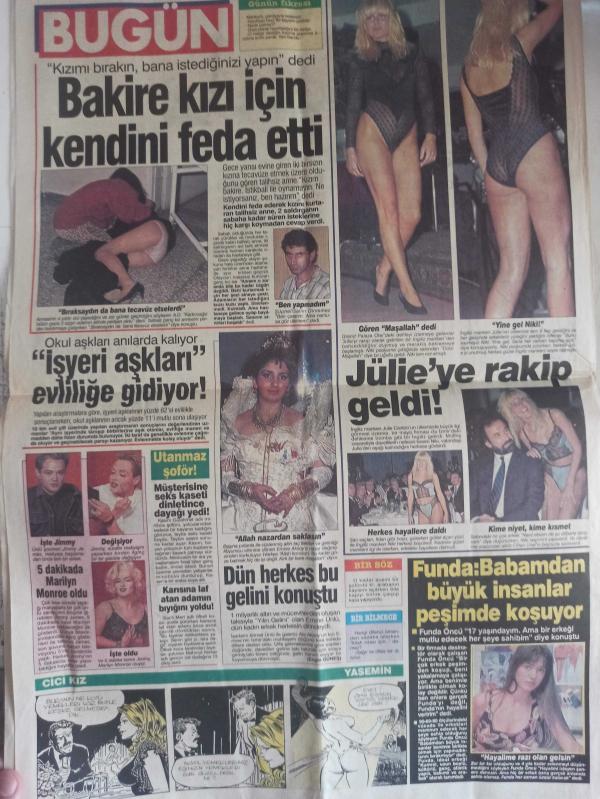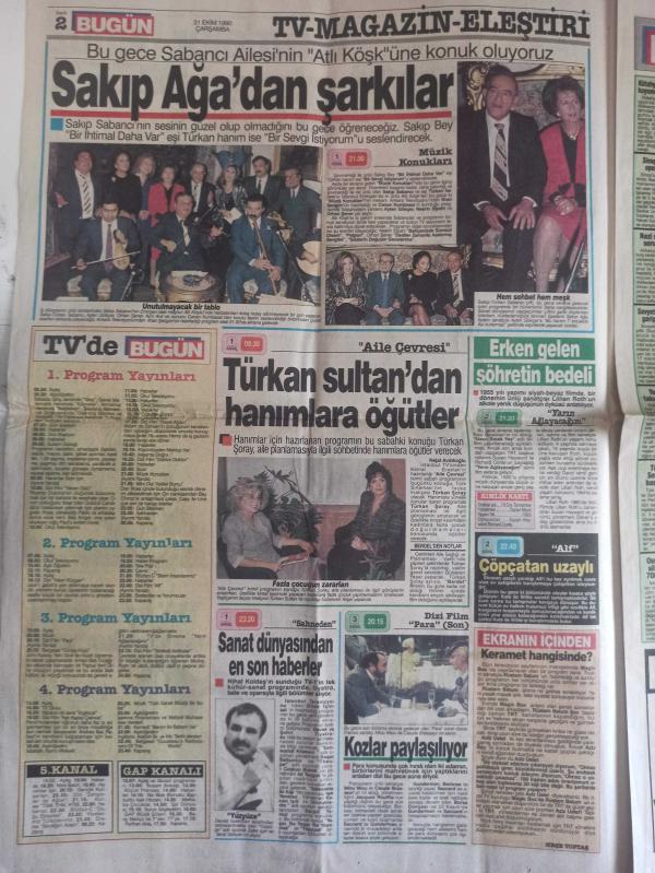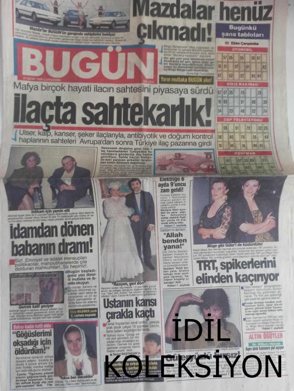 Bugün Magazin Gazetesi - 31 Ekim 1990 - Mazdalar Henüz Çıkmadı - İlaçta Sahtekarlık - İdamdan Dönen Babanın Dramı! - TRT, Spikerlerini Elinden Kaçırıyor - Güleryüzlü Hırsız - Cemile - Ustanın Karısı Çırakla Kaçtı - Bu Gece Sabancı Ailesi'nin ''Atlı Köşk'üne Konuk Oluyoruz - Sakıp Sabancı'dan Şarkılar - Türkan Şoray'dan Hanımlara Öğütler - Ekranın İçinden - Evli Adama Kendisini Kaçırttı - Güzel Melek Şeytan Çıktı - Rüşvet Yasaları - Bedrettin Dalan'ın Gözü Özürlülerde- Kuaförde Taksit Devri Başladı - Bana Bosna Canavarı Dediler - Gerçek Hayat Hikayeleri - Faizde Pazarlık Dönemi Başladı - Madalyonun Tersi - Ucuz Balık Sofraları Sevindirdi - Fener'e Holigan Saldırısı - Kartal 24 Kasım'da Zirvede - Rotariu ve Müller'in Hedefi Milli Takım - Güreş Mafyasına Türk Yumruğu! - Kara Murat - Dişi Cengaver - Gizli Ajan - Bakire Kızı İçin Kendini Feda Etti - Okul Aşkları Anılarda Kalıyor - Dün Herkes Bu Gelini Konuştu - Emine Ünlü - Julie'ye Rakip Geldi - Cihan Ünal - Funda Öncü - Babamdan Büyük İnsanlar Peşimde Koşuyor fotoğraf ve haberi - Tam Takım Gazete Yıpranma, sararmalar, kupon kesiği ve yırtılmalar zamana bağlı olarak görülebilir