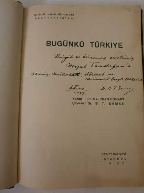 Bugünkü Türkiye / Ankara Eski Valisi Nevzat Tandoğan'a İmzalı, Stephan Ronart tarafından kaleme alınmıştır. Kitap 1937 yılında Matbuat Umum Müdürlüğü Neşriyatı tarafından [İstanbul] yayınlanmıştır. Bu baskının çevirisi B. T. Şaman tarafından yapılmıştır. 195 sayfadır. Bugünkü Türkiye / Ankara Eski Valisi Nevzat Tandoğan'a İmzalı adlı eser Türkçe dilindedir.