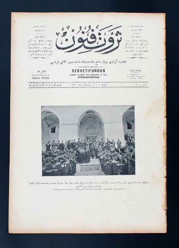 Osmanlıca Süreli Yayınlar Servet-i Fünun dergisi Sayı:704 7 Teşrin-i evvel 1904 tarihinde çıkmıştır 16 sayfadan oluşmaktadır 35,5x25,5 cm ebatlarında İçindekiler Musahabe-i Sıhhıyye (Tuz) Baharat Ağdiye Hikaye (13 numaralı Süret Katarı) Ön kapakta: Cennet mekan Hüdevendigar Gazi Hazretlerinin Bursa'da Çekirge'de Camii Şerifinin tamirinden sonra resmi küşadı haber ve fotoğraflıdır. Bol paşalı bir resimdir.