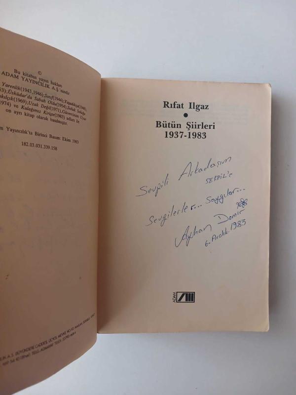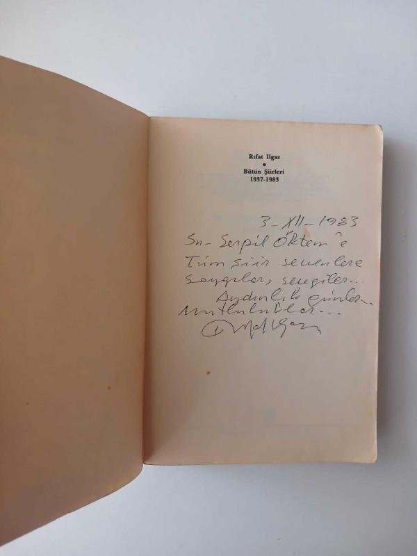 -Rıfat Ilgaz tarafından imzalı ve ithaflıdır. "3 - XII - 1983, Sn. Serpil Öktem'e, tüm şiir sevenlere saygılar, sevgiler... Aydınlık günler, mutluluklar..." yazmakta altında Rıfat Ilgaz'ın imzası yer almaktadır. -Künye sayfasında ise "Sevgili Arkadaşım Serpil'e Sevgiler... Saygılar... Aydın Demir 6 Aralık 1983" yazılıdır. - Kitabın 3 Aralık 1983 tarihinde Aydın Demir tarafından Serpil Öktem için Rıfat Ilgaz'a imzalatıldığı ve üç gün sonra Serpil Öktem'e hediye edildiği anlaşılmaktadır.