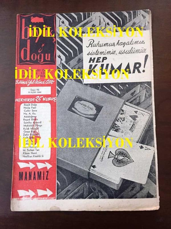 Büyük Doğu Dergisi (Dönemine ait, Orijinal) - Necip Fazıl Kısakürek - 46. SAYI - 13 EYLÜL 1946 - CAFER SENO - ADIDEĞMEZ - REŞAD EKREM - SAMİHA AYVERDİ - MUHİDDİN DİLEGE - KULAK MİSAFİRİ - ÖMER RIZA - ZAHİR GÜVEMLİ - SALİH ZEKİ - REFİK FİKRET - SAMİ KARAYEL - M. TURHAN TAN - KAZIM NAMİ - NESLİHAN KISAKÜREK - HEP KUMAR! - BAŞYÜCELİKTE CEZA ÖLÇÜSÜ - MEMURLUK-MEMURLAR - YİNE İKTİSAT ve TİCARET - HALKADAN PIRILTILAR - ÇUBUKDAR MEHMET BEY - TELEVİZYONDAN NELER BEKLENİYOR? - HADİSELERİN MUHASEBESİ - BİZ ve KOMŞULARIMIZ - ALTIN PARMAKLAR - MESİHPAŞA İMAMI - HALİS TARİH ÖLÇÜSÜ: 3 - OLGUNLUK DAVASI - ZAVALLI TÜRKÇE adlı eser Türkçe dilindedir.