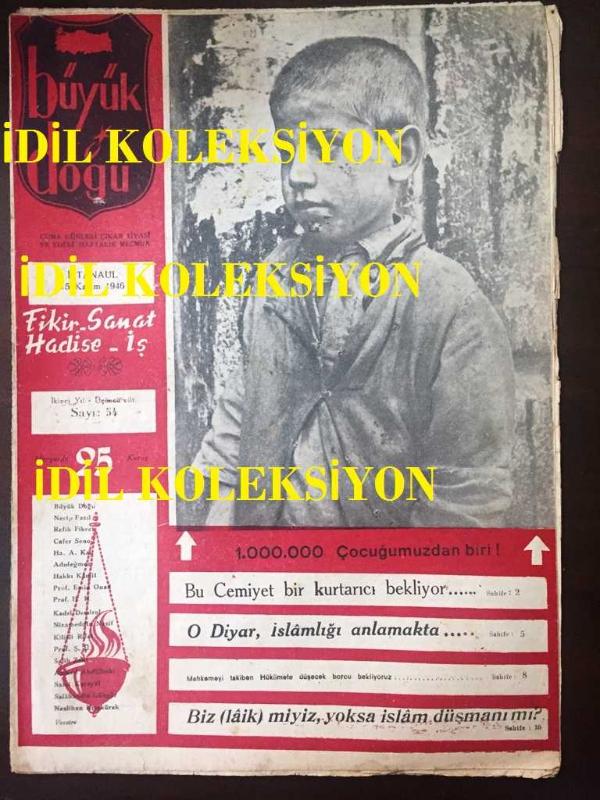 Büyük Doğu Dergisi (Dönemine ait, Orijinal) - Necip Fazıl Kısakürek - 54. SAYI - 15 KASIM 1946 - REFİK FİKRET - CAFER SENO - ADIDEĞMEZ - HAKKI KAMİL - PROF. EMİN ONAD - KADRİ DEMİROL - NİZAMEDDİN NAZİF - KİLİSLİ RIFAT - SALİH ZEKİ - AHMED ABDÜLBAKİ - SAMİ KARAYEL - SALAHADDİN GÜNGÖR - NESLİHYANK KISAKÜREK - 1,000,000 ÇOCUĞUMUZUN BİRİ - BU CEMİYET BİR KURTARICI BEKLİYOR - O DİYAR, İSLAMLIĞI ANLAMAKTA - BİZ (LAİK) MİYİZ, YOKSA İSLAM DÜŞMANI MI? - POETİKA: 7, ŞİİR VE CEMİYET - BU ADAM, BU ŞEHİR - YENİ BÜTÇE ETRAFINDA - ALLAH'IN MELEKLERİ - O DİYAR - MİMARİMİZ - BABASIZLAR VATANI - MÜSBET İLİMLER SANAT OLUNCA, PETROL KAYNAKLARININ KEŞFİ - HADİSELERİN MUHASEBESİ - İLK KOMEDYACILAR - AHMET ABDÜLBAKİ'DEN BİR HİKAYE - İÇ YÜZÜYLE ANDÜLHAMİT: 7 - TÜRKİYE (LAİK)DİR! - MUAŞRET EDEBİ, AĞIZ ŞAPIRDATMAK - ESKİ İKTİSAT VEKİLİ FUAT SİRMEN'DEN BİZE GELEN CEVAO adlı eser Türkçe dilindedir.