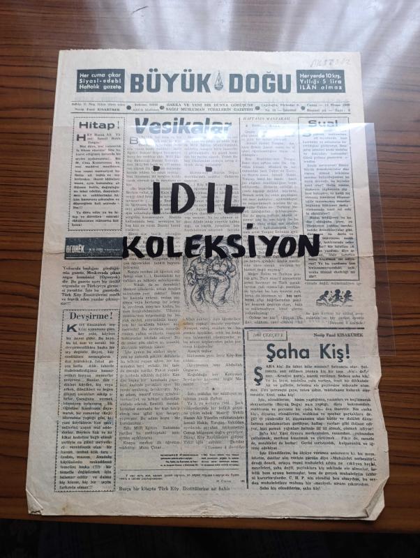 Büyük Doğu Gazetesi - Turkish Newspaper - 15 Nisan 1949 - Hitap hey Hasan Ali Yücel İsmail Hakkı Tonguç - vesikalar - haftanın manzarası - İsmail Hakkı Tonguç Ankara Erkek lisesi resim ve el işleri öğretmenliğine tayin edilmiştir - Moskova'da çıkan azgın komünist Ogonyek gazetesi bu gazete Türk köy enstitülerini methediyor - 1001 çerçeve Şaha Kiş yazan Necip Fazıl Kısakürek - sanat ilim dava ideoloji - aşırı solcular ve sağcılar kanunu - sahte ölüler - Mümin Kâfir - Ah O Vali Lütfi Kırdar - Yakup ve Yusuf peygamberler - çöle inen Nur yazan Necip Fazıl Kısakürek yazı dizisi - imamı rabbani Nebi Veli - bakın bir Fransız muharibi Lenin'in ölümünü nasıl anlatıyor - Gorki Köyü - Adana haruniye Düziçi köy enstitüsü'nde cereyan eden direğe komünist bayrağı çekilmesi hadisesi - Suriye işi - Fantoma Oyunu - şehvet örneği bir mani kınalı el isterim incecik bel isterim her gece gel isterim lazım seni ben seni - köy enstitüsünde yaşanan ahlaksız olaylar - Emine Akış ile öğretmen Mehmet Özdemir adlı eser, Kitap > Süreli Yayınlar > Gazeteler > Türkiye > Genel > Günlük kategorisinde İkinci El olarak satıştadır.