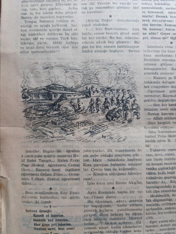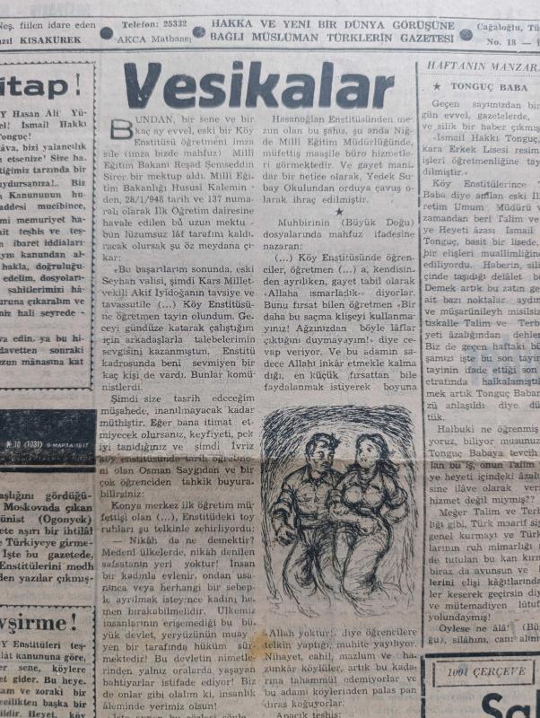 Büyük Doğu Gazetesi - Turkish Newspaper - 15 Nisan 1949 - Hitap hey Hasan Ali Yücel İsmail Hakkı Tonguç - vesikalar - haftanın manzarası - İsmail Hakkı Tonguç Ankara Erkek lisesi resim ve el işleri öğretmenliğine tayin edilmiştir - Moskova'da çıkan azgın komünist Ogonyek gazetesi bu gazete Türk köy enstitülerini methediyor - 1001 çerçeve Şaha Kiş yazan Necip Fazıl Kısakürek - sanat ilim dava ideoloji - aşırı solcular ve sağcılar kanunu - sahte ölüler - Mümin Kâfir - Ah O Vali Lütfi Kırdar - Yakup ve Yusuf peygamberler - çöle inen Nur yazan Necip Fazıl Kısakürek yazı dizisi - imamı rabbani Nebi Veli - bakın bir Fransız muharibi Lenin'in ölümünü nasıl anlatıyor - Gorki Köyü - Adana haruniye Düziçi köy enstitüsü'nde cereyan eden direğe komünist bayrağı çekilmesi hadisesi - Suriye işi - Fantoma Oyunu - şehvet örneği bir mani kınalı el isterim incecik bel isterim her gece gel isterim lazım seni ben seni - köy enstitüsünde yaşanan ahlaksız olaylar - Emine Akış ile öğretmen Mehmet Özdemir, Necip Fazıl Kısakürek tarafından kaleme alınmıştır. Büyük Doğu Gazetesi - Turkish Newspaper - 15 Nisan 1949 - Hitap hey Hasan Ali Yücel İsmail Hakkı Tonguç - vesikalar - haftanın manzarası - İsmail Hakkı Tonguç Ankara Erkek lisesi resim ve el işleri öğretmenliğine tayin edilmiştir - Moskova'da çıkan azgın komünist Ogonyek gazetesi bu gazete Türk köy enstitülerini methediyor - 1001 çerçeve Şaha Kiş yazan Necip Fazıl Kısakürek - sanat ilim dava ideoloji - aşırı solcular ve sağcılar kanunu - sahte ölüler - Mümin Kâfir - Ah O Vali Lütfi Kırdar - Yakup ve Yusuf peygamberler - çöle inen Nur yazan Necip Fazıl Kısakürek yazı dizisi - imamı rabbani Nebi Veli - bakın bir Fransız muharibi Lenin'in ölümünü nasıl anlatıyor - Gorki Köyü - Adana haruniye Düziçi köy enstitüsü'nde cereyan eden direğe komünist bayrağı çekilmesi hadisesi - Suriye işi - Fantoma Oyunu - şehvet örneği bir mani kınalı el isterim incecik bel isterim her gece gel isterim lazım seni ben seni - köy enstitüsünde yaşanan ahlaksız olaylar - Emine Akış ile öğretmen Mehmet Özdemir adlı eser Türkçe dilindedir.