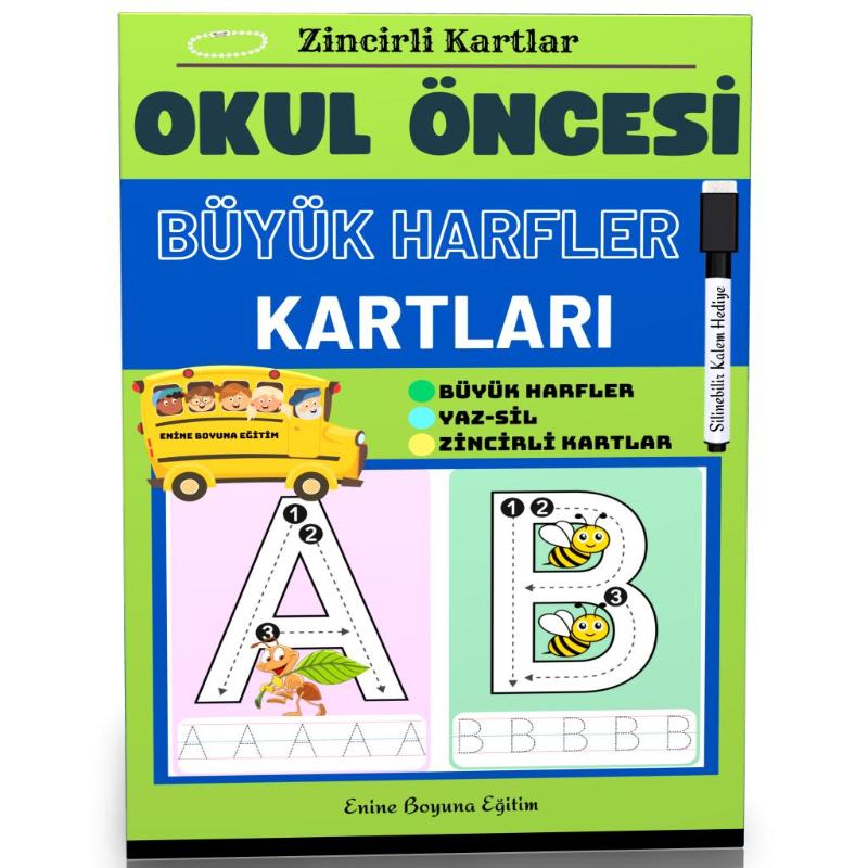 Büyük Harfler Çalışma Kartları (Laminasyonlu) Türkiye’de İLK Defa YAZ-SİL Büyük Harfler Çalışma Kartları Büyük Harfler EZBER Kartları Yaz-Sil, Tekrar tekrar yaz sil. Bitmeyen kartlardır. Silinebilir Kalemle yazıp, silip tekrar tekrar yazacaksınız. 105 x 148 küçük ebatlarıyla yanınızda taşıyabileceksiniz. Zincirli Büyük Harfler EZBER KARTLARI 26 Harften ve 13 Laminasyondan oluşmaktadır. Piyasada bugüne kadar kartlar kartona baskılı halde yapılmıştır ve yırtılması, kırılması çok kolaydır. Ancak 125 Micron laminasyona yapılan kartlar dijital renkli ve 120 gramajlı kağıda baskı yapıldığı için yaklaşık 245 gramajı kalın kağıt ortaya çıkmıştır. Süper çalışma kartlarıyla çocuğunuz harikalar yaratacaktır. Okula hazır hale gelecektir. Harflerin doğru kullanımını öğreneceklerdir. Çünkü nasıl başlarsa o şekilde gider. Sonra öğrenmesi zorlaşacaktır. Kartlar zincirle birbirine tutturulmuştur. Büyük Harfler Çalışma Kartları (Laminasyonlu) Kaç Karttan Oluşmaktadır: 13 Laminasyon Karttan Oluşmaktadır. Büyük Harfler Çalışma Kartları (Laminasyonlu) Faydaları: Harflerin yazımını doğru şekilde öğreneceklerdir. Okulun temeli alfabeyle başlamaktadır. Alfabede ise önce büyük harfler öğretilir ve çocukların tüm eğitimi bunun üzerine bina edilir. Onun için Alfabe çok önemlidir. Okula hazır hale gelecektir. Farkındalık yaratacak ve akranlarından daha iyi olacaklardır. Okulu sevecek ve okumaya, yazmaya merakları olacaklardır.