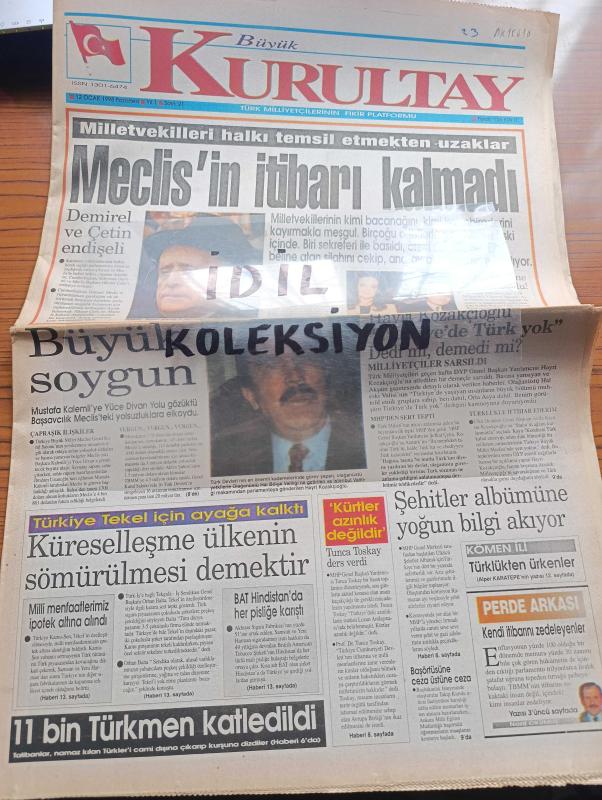 Büyük Kurultay Gazetesi - Turkish Newspaper - 12 Ocak 1998 - milletvekilleri halkı temsil etmekten uzaklar meclisin itibarını kalmadı - Süleyman Demirel ve Hikmet Çetin endişeli - Hayri Kozakçıoğlu Türkiye'de Türk yok dedi mi demedi mi - Tunca Toskay kürtler azınlık değildir - şehitler albümüne yoğun bilgi akıyor - başörtüsüne ceza üstüne ceza - Türkiye Tekel için ayağa kalktı - Büyük soygun Mustafa Kalemli'ye yüce divan yolu gözüktü - Ruslar Narmirza'nın başını kesip Kurban bayramında eve yolladılar - Suriye Kürtleri kendi çıkarları için kullanıyor - DHKPC'nin hedefi İncirlik üssü - yoksulluk sınırı 131,5 milyon lira - Talibanlar 11 bin Türkmen'i katlettiler - Mevlüt Uluğtekin Yılmaz'ın son kitabı Azerbaycan'da yayınlandı - Çözümün adı ülkücü hareket - büyük Türk milletine Noel mi Asimile mi - Onbir Ayın sultanı ramazan sayfası - boğazlara hakim olmamız gerekiyor - boğaz için Petrol en büyük tehlike - Bakü Ceyhan hattı tam gaz - Rusya ile Yunanistan limanda anlaştı adlı eser, Kitap > Süreli Yayınlar > Gazeteler > Türkiye > Genel > Günlük kategorisinde İkinci El olarak satıştadır.
