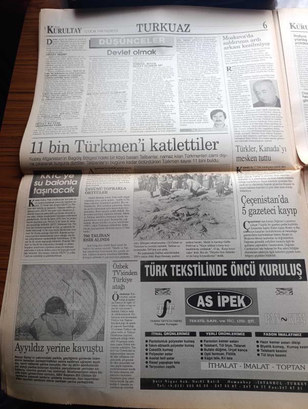Büyük Kurultay Gazetesi - Turkish Newspaper - 12 Ocak 1998 - milletvekilleri halkı temsil etmekten uzaklar meclisin itibarını kalmadı - Süleyman Demirel ve Hikmet Çetin endişeli - Hayri Kozakçıoğlu Türkiye'de Türk yok dedi mi demedi mi - Tunca Toskay kürtler azınlık değildir - şehitler albümüne yoğun bilgi akıyor - başörtüsüne ceza üstüne ceza - Türkiye Tekel için ayağa kalktı - Büyük soygun Mustafa Kalemli'ye yüce divan yolu gözüktü - Ruslar Narmirza'nın başını kesip Kurban bayramında eve yolladılar - Suriye Kürtleri kendi çıkarları için kullanıyor - DHKPC'nin hedefi İncirlik üssü - yoksulluk sınırı 131,5 milyon lira - Talibanlar 11 bin Türkmen'i katlettiler - Mevlüt Uluğtekin Yılmaz'ın son kitabı Azerbaycan'da yayınlandı - Çözümün adı ülkücü hareket - büyük Türk milletine Noel mi Asimile mi - Onbir Ayın sultanı ramazan sayfası - boğazlara hakim olmamız gerekiyor - boğaz için Petrol en büyük tehlike - Bakü Ceyhan hattı tam gaz - Rusya ile Yunanistan limanda anlaştı, Ahmet Çelik tarafından kaleme alınmıştır. Büyük Kurultay Gazetesi - Turkish Newspaper - 12 Ocak 1998 - milletvekilleri halkı temsil etmekten uzaklar meclisin itibarını kalmadı - Süleyman Demirel ve Hikmet Çetin endişeli - Hayri Kozakçıoğlu Türkiye'de Türk yok dedi mi demedi mi - Tunca Toskay kürtler azınlık değildir - şehitler albümüne yoğun bilgi akıyor - başörtüsüne ceza üstüne ceza - Türkiye Tekel için ayağa kalktı - Büyük soygun Mustafa Kalemli'ye yüce divan yolu gözüktü - Ruslar Narmirza'nın başını kesip Kurban bayramında eve yolladılar - Suriye Kürtleri kendi çıkarları için kullanıyor - DHKPC'nin hedefi İncirlik üssü - yoksulluk sınırı 131,5 milyon lira - Talibanlar 11 bin Türkmen'i katlettiler - Mevlüt Uluğtekin Yılmaz'ın son kitabı Azerbaycan'da yayınlandı - Çözümün adı ülkücü hareket - büyük Türk milletine Noel mi Asimile mi - Onbir Ayın sultanı ramazan sayfası - boğazlara hakim olmamız gerekiyor - boğaz için Petrol en büyük tehlike - Bakü Ceyhan hattı tam gaz - Rusya ile Yunanistan limanda anlaştı adlı eser Türkçe dilindedir.