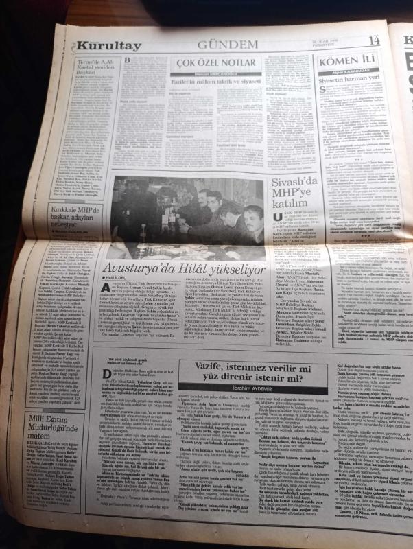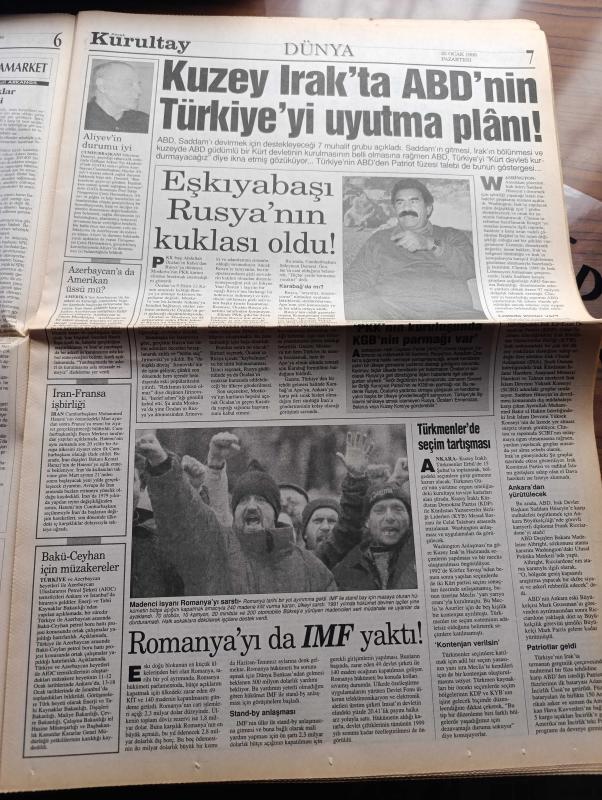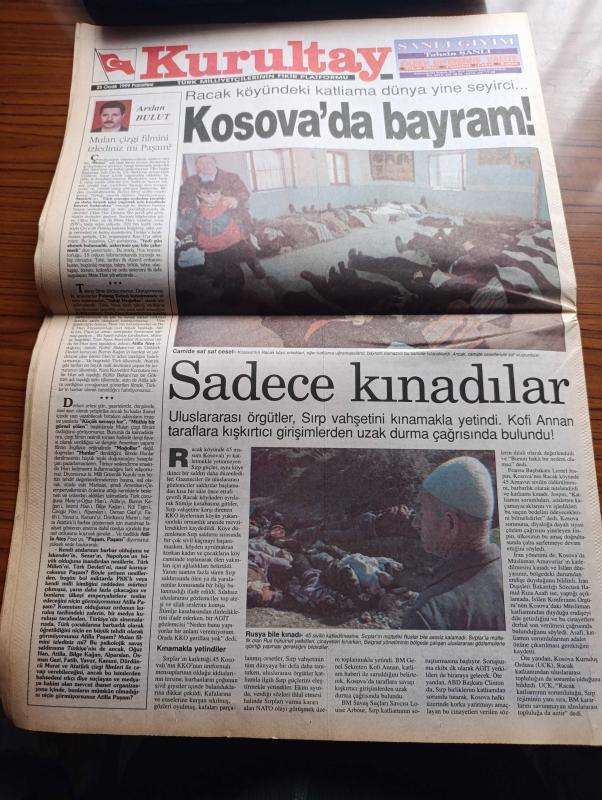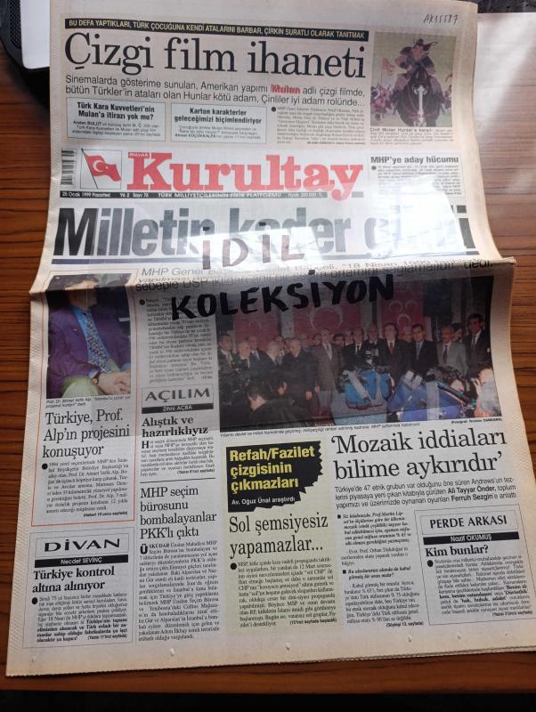 Büyük Kurultay Gazetesi - Turkish Newspaper - 25 Ocak 1999 - sinemalarda gösterime sunulan Amerikan yapımı Mulan adlı çizgi filmde Hunlar kötü adam Çinliler iyi adam rolünde - MHP'ye aday hücumu - MHP Genel Başkanı Devlet Bahçeli 18 Nisan 1999 tarihinde yapılması gereken seçimler milletimiz için kader günüdür dedi fotoğraf - Türkiye Profesör Ahmet Vefik Alp'in projesini konuşuyor - Üsküdar'da MHP seçim bürosunu bombalayanlar PKK'lı çıktı - Ali Tayyar Önder Türkiye'de mozaik bir etnik grup var iddiaları bilim aykırıdır fotoğraf - Refah Fazilet çizgisinin çıkmazları Avukat Oğuz Ünal araştırdı - kim bunlar yazan Nazif Okumuş - soygunculuğun yeni adı banka batırmak - Ülküm işçiler Umut seçimlerde - eşkıyabaşı Abdullah Öcalan Rusya'nın kuklası oldu - Romanya'yı da IMF yaktı - PKK'nın kuruluşunda KGB'nin parmağı var - İstanbul'da 5,5 milyon kişi oy kullanacak - Tansu Çiller'in umudu Tony Blair'cilikte - kanımızı kaynatan şiirler - Fahri Ersavaş - Türkiye'nin %90'ı Türk'üm diyor adlı eser, Kitap > Süreli Yayınlar > Gazeteler > Türkiye > Genel > Günlük kategorisinde İkinci El olarak satıştadır.