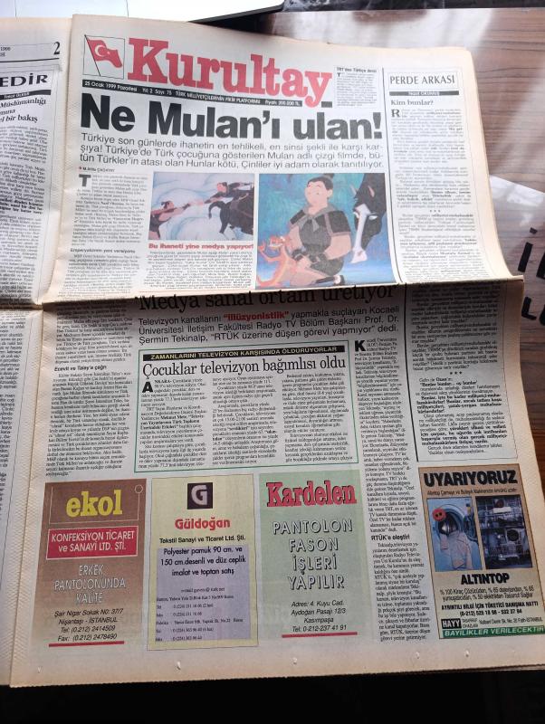 Büyük Kurultay Gazetesi - Turkish Newspaper - 25 Ocak 1999 - sinemalarda gösterime sunulan Amerikan yapımı Mulan adlı çizgi filmde Hunlar kötü adam Çinliler iyi adam rolünde - MHP'ye aday hücumu - MHP Genel Başkanı Devlet Bahçeli 18 Nisan 1999 tarihinde yapılması gereken seçimler milletimiz için kader günüdür dedi fotoğraf - Türkiye Profesör Ahmet Vefik Alp'in projesini konuşuyor - Üsküdar'da MHP seçim bürosunu bombalayanlar PKK'lı çıktı - Ali Tayyar Önder Türkiye'de mozaik bir etnik grup var iddiaları bilim aykırıdır fotoğraf - Refah Fazilet çizgisinin çıkmazları Avukat Oğuz Ünal araştırdı - kim bunlar yazan Nazif Okumuş - soygunculuğun yeni adı banka batırmak - Ülküm işçiler Umut seçimlerde - eşkıyabaşı Abdullah Öcalan Rusya'nın kuklası oldu - Romanya'yı da IMF yaktı - PKK'nın kuruluşunda KGB'nin parmağı var - İstanbul'da 5,5 milyon kişi oy kullanacak - Tansu Çiller'in umudu Tony Blair'cilikte - kanımızı kaynatan şiirler - Fahri Ersavaş - Türkiye'nin %90'ı Türk'üm diyor, Ahmet Çelik tarafından kaleme alınmıştır. Büyük Kurultay Gazetesi - Turkish Newspaper - 25 Ocak 1999 - sinemalarda gösterime sunulan Amerikan yapımı Mulan adlı çizgi filmde Hunlar kötü adam Çinliler iyi adam rolünde - MHP'ye aday hücumu - MHP Genel Başkanı Devlet Bahçeli 18 Nisan 1999 tarihinde yapılması gereken seçimler milletimiz için kader günüdür dedi fotoğraf - Türkiye Profesör Ahmet Vefik Alp'in projesini konuşuyor - Üsküdar'da MHP seçim bürosunu bombalayanlar PKK'lı çıktı - Ali Tayyar Önder Türkiye'de mozaik bir etnik grup var iddiaları bilim aykırıdır fotoğraf - Refah Fazilet çizgisinin çıkmazları Avukat Oğuz Ünal araştırdı - kim bunlar yazan Nazif Okumuş - soygunculuğun yeni adı banka batırmak - Ülküm işçiler Umut seçimlerde - eşkıyabaşı Abdullah Öcalan Rusya'nın kuklası oldu - Romanya'yı da IMF yaktı - PKK'nın kuruluşunda KGB'nin parmağı var - İstanbul'da 5,5 milyon kişi oy kullanacak - Tansu Çiller'in umudu Tony Blair'cilikte - kanımızı kaynatan şiirler - Fahri Ersavaş - Türkiye'nin %90'ı Türk'üm diyor adlı eser Türkçe dilindedir.