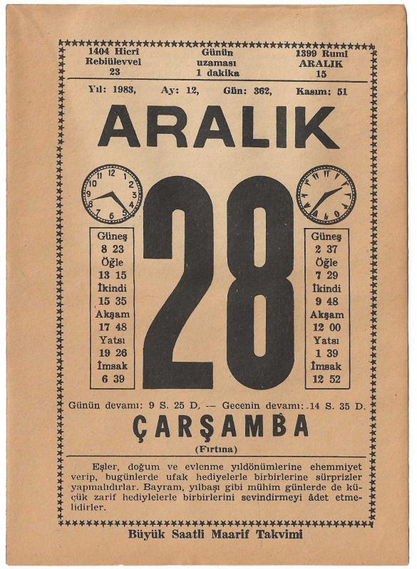 Büyük Saatli Maarif Takvimi / 28 Aralık 1983 Çarşamba, en son 1 yıl önce güncellenmiştir.