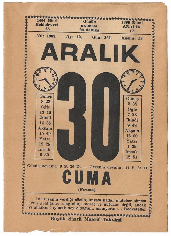 Büyük Saatli Maarif Takvimi, 30 Aralık 1983 Cuma günü yaprağı.