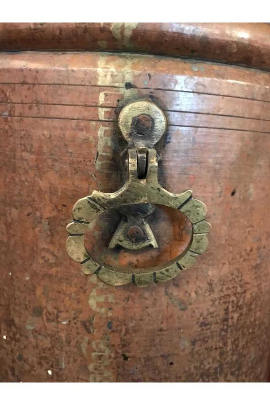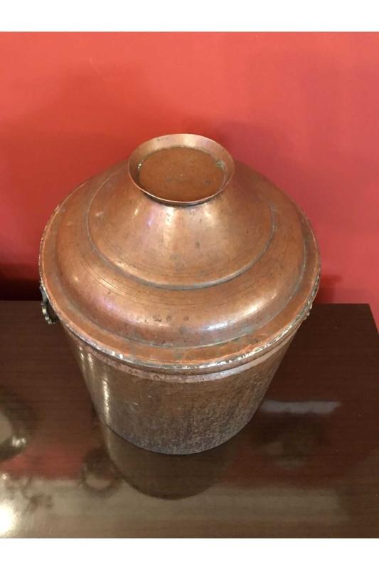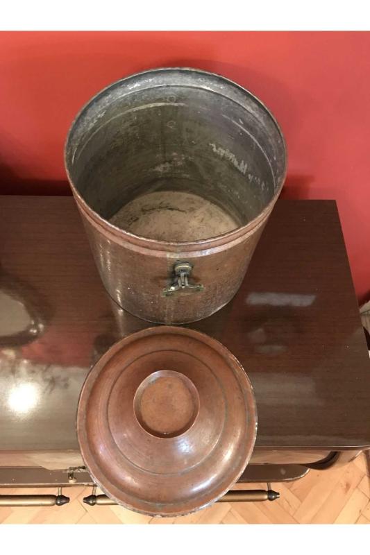 Büyük boy bakır kapaklı kova 38 cm boyunda 27 cm çapında başlıklı antika/koleksiyon objesinin menşei belirtilmemiştir. Objenin ait olduğu dönem bilinmeketedir.