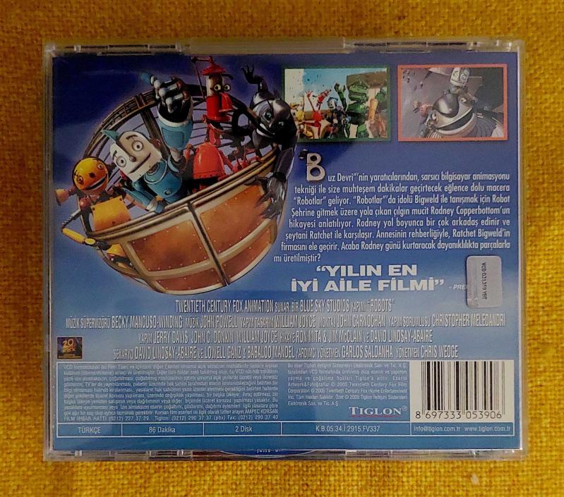 Buz Devri'nin Yaratıcılarından. Robotlar "Robots", Türkçe Dublaj. 86 Dakika-2 Disk. 2005. "Yılın En İyi Aile Filmi" * Çizgi Film (Animasyon) / VCD Video. * Video Çiziksiz-Temiz ve Sıfır Durumdadır. * 20th Century Fox Home Entertainment. Tiglon.
