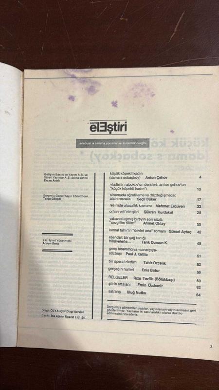 ÇAĞDAŞ ELEŞTİRİ, EDEBİYAT, SANAT, SORUNLAR VE KURAMLAR DERGİSİ - EYLÜL 1983 EDİP CANSEVER - AHMET OKTAY - ENİS BATUR - ŞÜKRAN KURDAKUL - SEÇİL BÜKER - MEHMET ERGÜVEN - ERCAN ANKLI - TANJU GÖKÇÖL - ANTON ÇEHOV - VLADİMİR NABOKOV - GÜRSEL AYTAÇ - TARIK DURSUN K. - ADNAN BENK - PAUL J. GRILLO - TAHİR ÖZÇELİK - RIZA TEVFİK (BÖLÜKBAŞI) - EMİN ÖZDEMİR - ULUĞ NUTKU BİR ÖYKÜ NASIL İNCELENİR? ÇEHOV’UN "KÜÇÜK KÖPEKLİ KADINI" VE NABOKOV’UN YORUMU - EDİP CANSEVER VE ÖLÜM - BİZİ AYIRAN, GERÇEĞİ KAVRAYIŞ BİÇİMİMİZDİR - ORHAN VELİ’DE DUYGUSAL HALKÇILIK EĞİLİMİ - ALAIN RESNAIS VE DİLBİLİMSEL ÖRNEKÇELER - ULUSALLIĞA SIĞINAN RESSAMLAR SONUNDA RESME İHANET EDERLER - KÜÇÜK KÖPEKLİ KADIN - VLADİMİR NABOKOV’UN DERSLERİ - SİNEMADA EĞRETİLEME VE DÜZDEĞİŞMECE - RESİMDE ULUSALLIK KAVRAMI - ORHAN VELİ’NİN ŞİİRİ - YABANCILAŞMIŞ BİREYİN SON SÖZÜ: "SEVGİLİM ÖLÜM" - KEMAL TAHİR’İN "DEVLET ANA" ROMANI - ESENDAL: BİR ÇAĞ TANIĞI - GENÇ TASARIMCIYA-SANATÇIYA-SÖZBAŞI - BİR OPERA İZLEDİM - GERÇEĞİN HALLERİ - - 66 SAYFA adlı eser, Kitap > Edebiyat, Kurgu > Edebiyat Bilimi kategorisinde İkinci El olarak satıştadır.