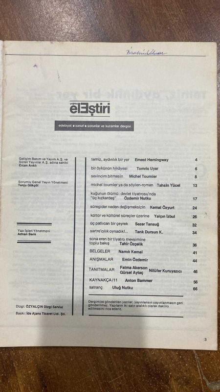 ÇAĞDAŞ ELEŞTİRİ, EDEBİYAT, SANAT, SORUNLAR VE KURAMLAR DERGİSİ -HAZİRAN 1983 MICHEL TOURNIER - ERNEST HEMINGWAY - TAHŞİN YÜCEL - TOMRİS UYAR - ÖZDEMİR NUTKU - FATMA AKERSON - NİLÜFER KURUYAZICI - YALÇIN İZBUL - EMİN ÖZDEMİR - KEMAL ÖZYURT - SEZER TANSUĞ - TARIK DURSUN K. - TAHİR ÖZÇELİK - NAMIK KEMAL - EMİN ÖZDEMİR - GÜRSEL AYTAÇ - ANTON BAMMER - ULUĞ NUTKU - ERCAN ARIKLI - TANJU GÖKÇÖL - ADNAN BENK - AYDIN YALKUT - CEYDA YAZICIOĞLU - ÖMER BARANİOĞLU - CİHAT SÖYLEMEZ SEVİNCİM BİTMESİN - İKİ ÖYKÜ, İKİ YORUM - TEMİZ, AYDINLIK BİR YER: BİR ÖYKÜNÜN HİKÂYESİ - MICHEL TOURNIER YA DA SÖYLEN-ROMAN - KUĞUNUN ÖLÜMÜ: DEVLET TİYATROSU’NDA “ÜÇ KIZKARDEŞ” - ŞAİRİN ŞİİRİNİ YENMESİ - “TENEKE TRAMPET” - KÜLTÜR VE KÜLTÜREL SÜREÇLER ÜZERİNE - ELEŞTİRİNİN ALTYAPISI - SÜREGİDER NEDEN DEĞİŞMEKSİZİN - ÜÇ PATLICAN BİR ÇEYREK - SARTRE’CILIK OYNADIK!.. - SONA EREN BİR TİYATRO MEVSİMİNE TOPLU BAKIŞ - BELGELER - ANIŞMALAR - TANITMALAR - KAYNAKÇA - SATRANÇ - 66 SAYFA adlı eser, Kitap > Edebiyat, Kurgu > Edebiyat Bilimi kategorisinde İkinci El olarak satıştadır.
