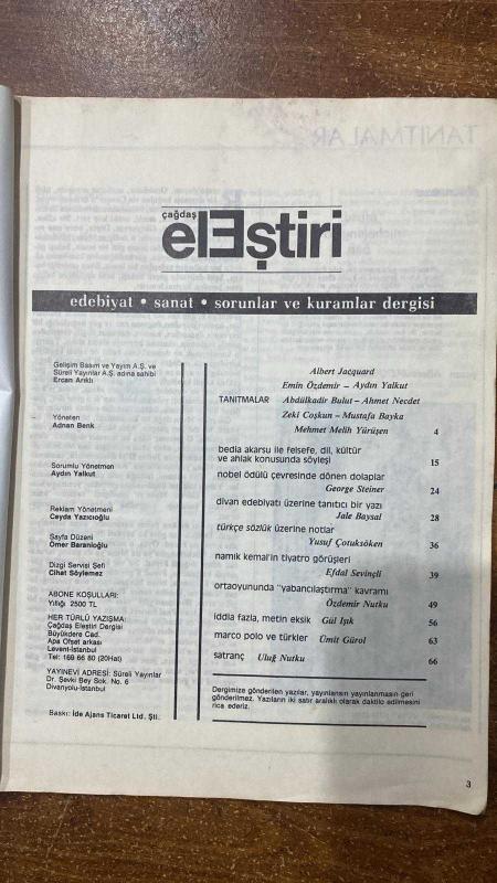 ÇAĞDAŞ ELEŞTİRİ, EDEBİYAT, SANAT, SORUNLAR VE KURAMLAR DERGİSİ - OCAK 1985 ALBERT JACQUARD - EMİN ÖZDEMİR - MUSTAFA BAYKA - ABDÜLKADİR BULUT - AYDIN YALKUT - AHMET NECDET - ZEKİ COŞKUN - MEHMET MELİH YÜRÜŞEN - BEDİA AKARSU - GEORGE STEINER - JALE BAYSAL - YUSUF ÇOTUKSÖKEN - EFDAL SEVİNÇLİ - ÖZDEMİR NUTKU - GÜL IŞIK - ÜMİT GÜROL - HÜSEYİN YURTTAŞ - FİKRET DEMİRAD - RAMİS DARA - MAURICE BLANCHOT - ULUĞ NUTKU - ERCAN ARIKLI - ADNAN BENK - AYDIN YALKUT - CEYDA YAZICIOĞLU - ÖMER BARANİOĞLU - CİHAT SÖYLEMEZ TANITMALAR - BEDİA AKARSU İLE FELSEFE, DİL, KÜLTÜR VE AHLAK KONUSUNDA SÖYLEŞİ - NOBEL ÖDÜLÜ ÇEVRESİNDE DÖNEN DOLAPLAR - DİVAN EDEBİYATI ÜZERİNE TANITICI BİR YAZI - TÜRKÇE SÖZLÜK ÜZERİNE NOTLAR - NAMIK KEMAL’İN TİYATRO GÖRÜŞLERİ - ORTAOYUNUNDA “YABANCILAŞTIRMA” KAVRAMI - İDDİA FAZLA, METİN EKSİK - MARCO POLO VE TÜRKLER - GECEDE KANAT SESLERİ - AKDENİZLİ ŞİİRLER VE AŞK SÖZLERİ - CELLADIMA GÜLÜMSERKEN - BELGELER - ANIŞMALAR - KAYNAKÇA - SATRANÇ - 66 SAYFA, ERCAN ARIKLI tarafından kaleme alınmıştır. Eser TANJU GÖKÇÖL editörlüğünde hazırlanmıştır. Kitap . tarafından yayınlanmıştır. 66 sayfadır. ÇAĞDAŞ ELEŞTİRİ, EDEBİYAT, SANAT, SORUNLAR VE KURAMLAR DERGİSİ - OCAK 1985 ALBERT JACQUARD - EMİN ÖZDEMİR - MUSTAFA BAYKA - ABDÜLKADİR BULUT - AYDIN YALKUT - AHMET NECDET - ZEKİ COŞKUN - MEHMET MELİH YÜRÜŞEN - BEDİA AKARSU - GEORGE STEINER - JALE BAYSAL - YUSUF ÇOTUKSÖKEN - EFDAL SEVİNÇLİ - ÖZDEMİR NUTKU - GÜL IŞIK - ÜMİT GÜROL - HÜSEYİN YURTTAŞ - FİKRET DEMİRAD - RAMİS DARA - MAURICE BLANCHOT - ULUĞ NUTKU - ERCAN ARIKLI - ADNAN BENK - AYDIN YALKUT - CEYDA YAZICIOĞLU - ÖMER BARANİOĞLU - CİHAT SÖYLEMEZ TANITMALAR - BEDİA AKARSU İLE FELSEFE, DİL, KÜLTÜR VE AHLAK KONUSUNDA SÖYLEŞİ - NOBEL ÖDÜLÜ ÇEVRESİNDE DÖNEN DOLAPLAR - DİVAN EDEBİYATI ÜZERİNE TANITICI BİR YAZI - TÜRKÇE SÖZLÜK ÜZERİNE NOTLAR - NAMIK KEMAL’İN TİYATRO GÖRÜŞLERİ - ORTAOYUNUNDA “YABANCILAŞTIRMA” KAVRAMI - İDDİA FAZLA, METİN EKSİK - MARCO POLO VE TÜRKLER - GECEDE KANAT SESLERİ - AKDENİZLİ ŞİİRLER VE AŞK SÖZLERİ - CELLADIMA GÜLÜMSERKEN - BELGELER - ANIŞMALAR - KAYNAKÇA - SATRANÇ - 66 SAYFA adlı eser Türkçe dilindedir.