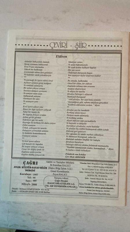 ÇAĞRI KÜLTÜR, SANAT, BİLİM DERGİSİ - NİSAN 2000 SAYI: 485 FEYZI HALICI - MONAD BALKAN - SEYIT KÜÇÜKBEZİRCİ - FIKRET SEZGIN - ONUR SAKARYA - FUAT ÖNDER - KAYA ÖZDEMİR - HALUK ŞAN DİKMEN - N. YALÇIN DİKİLİTAŞ - MEHMET K. GÜNDOĞDU - HASAN ÖZÖNDER - HILMI ISGÜZAR - M. KEMAL YILMAZ - ŞENEL ÖZPOLAT - ABDULLAH ŞATOĞLU - M. HALISTIN KUKUL - HIKMET GÜLAY - HALISE ÖZTÜRKMEN - NECMIYE KURU - EMINE SÖNMEZ - MELDA ÓZATA - CANAN DONAT - AYTEN CERAN - HALIM YAĞCIOĞLU - HALIL USLU - FAHRI ERSAVAŞ - MURAT ÖZMEN - AHMET SEVGI - AHMET ÖZDEMİR - HASAN AYDIN - MEHMET GÜNEŞ - A. NECMETTIN ÇANGA - ABDÜLKADIR GÜLER - NIHAT AŞAR - ERTUĞRUL ŞAKAR - MUSTAFA CEYLAN - FAIKA SARP - AŞIK ŞEREF TAŞLIOVA - MURAT ÇOBANOĞLU - RASIM KOROĞLU - M. TAHIR SAKMAN - FRIEDRICH VON SCHILLER - RIZA AKDEMİR - M.EMREHAN HALICI - MEHMET GÜMÜŞTEKİN ÇAĞRI'YA ABONE OLUNUZ - NEVRUZ - AŞIK VEYSEL'LE KIRK BİR YIL ÖNCE YAPILAN BİR KONUŞMA - ÇEVİRİ ŞİİR - ELDIVEN - KÜLTÜR SANAT BİLİM DERGİSİ - TAM TAKIM EKSİKSİZ 32 SAYFA adlı eser, Kitap > Süreli Yayınlar > Dergiler > Magazin, Moda kategorisinde İkinci El olarak satıştadır.