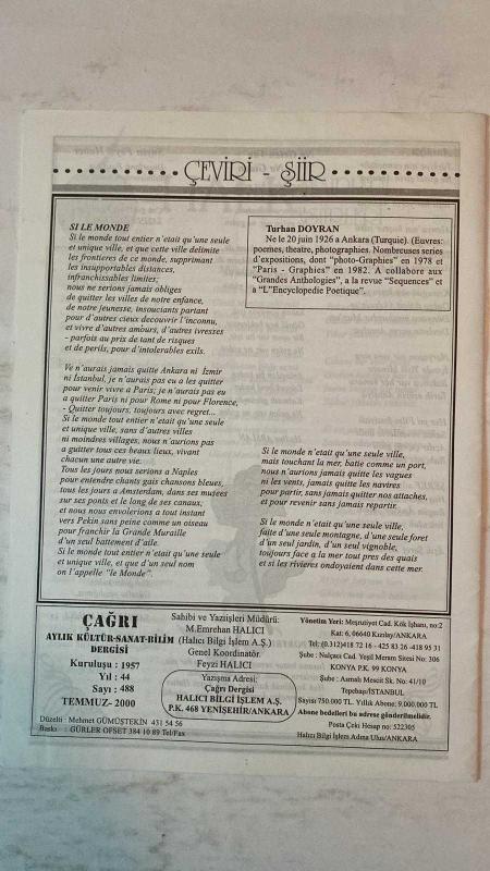 ÇAĞRI KÜLTÜR, SANAT, BİLİM DERGİSİ - TEMMUZ 2000 SAYI: 488 FEYZI HALICI - MONAD BALKAN - SAMI ZUBAIDA - M. HALISTIN KUKUL - FAZIL BAYRAKTAR - ABDULLAH SATOĞLU - HALUK ŞAN DİKMEN - ALI NAILI ERDEM - HALIL SOYUER - AHMET ÖZDEMİR - NEVIN KORUCUOĞLU - MEHMET GÜNER - MURAT ÖZMEN - FAIKA SARP - HIKMET ÖZDEMİR - HALISE ÖZTÜRKMEN - HASAN MERCAN - M. ALI KALKAN - ABDÜLDAKIR GÜLER - CEVDET ASLANGÜL - MUZAFFER UYGUNER - YÜKSEL GEMALMAZ - HASAN UKDEM - HASAN AYDIN - MEHMET GÜNDOĞDU - ERHAN BİLGENOĞLU - NURTEN ÖZCAN - AŞIK SEYFI MERAMI - HADIYE ARSLAN - AŞIK BEHRAM AKTIMUR - ISMETI - AŞIK ŞEREF TAŞLIOVA - IBRAHIM ALTINSÖZ - FARUK ORAY - TURHAN DOYRAN DUYSANA - AŞIKLAR BAYRAMI - ÇAĞRI'YA ABONE OLUNUZ - ŞİİRLE ARKADAŞLIK - SON POSTA'DA İLK ŞİİR - HALI MAĞAZASINDA ŞİİR SOHBETLERİ - AŞIK MEHMET AĞA - KONYA'DA SANAT VE KÜLTÜR - İLK ÂŞIKLAR BAYRAMI 1966 - YARIŞMA DALLARI VE SEÇİCİLER KURULU - SI LE MONDE (ÇEVİRİ ŞİİR) - DÜNYA TEK BİR ŞEHİR OLSAYDI - TURHAN DOYRAN FRANSIZCA - TAM TAKIM EKSİKSİZ 32 SAYFA adlı eser, Kitap > Süreli Yayınlar > Dergiler > Magazin, Moda kategorisinde İkinci El olarak satıştadır.