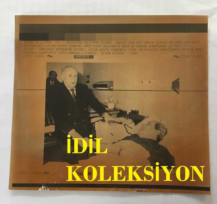 ÇALIŞMA ve SOSYAL GÜVENLİK ESKİ BAKANI AYDIN GÜVEN GÜRKAN'IN ORİJİNAL AJANS-BASIN FOTOĞRAFI (KAĞIT BASKI) - 21 x 19 cm EBADINDA - AYDIN GÜVEN GÜRKAN TRAFİK KAZASI SONRASINDA HASTANEDE YATARKEN KENDİSİNİ ZİYARET EDEN SÜLEYMAN DEMİREL'LE AYNI KAREDE, 1992, en son 5 ay önce güncellenmiştir.