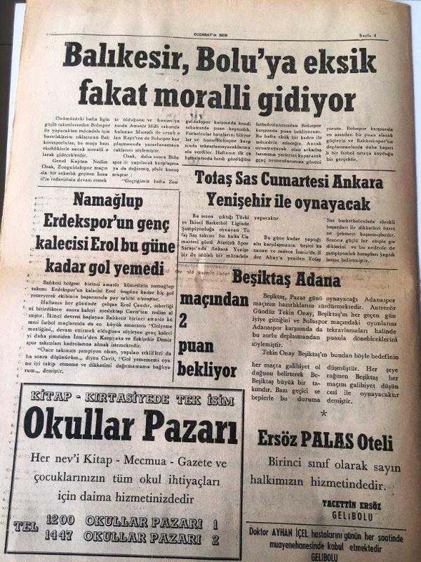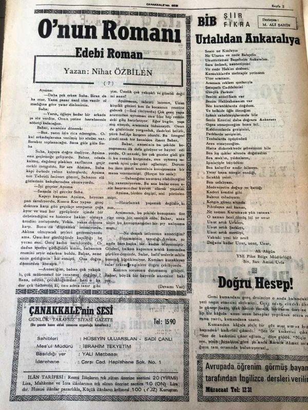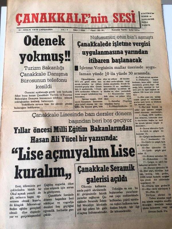 ÇANAKKALE ÇANAKKALE 'NİN SESİ YEREL TAŞRA BASINI- - 31 Aralık 1975 YIL :2 SAYI :398- Ödenek Yokmuş - Çanakkale İşletme Vergisi Uygulamasına Yarından İtibaren Başlanacak --Yıllar öncesi Milli Eğitim Bakanlarından Hasan Ali Yücel bir yazısında ----Onun Romanı Edebi Roman : Yazan : Nihat Özbilen -Şiir : Urfalıdan Ankaralıya ALİ AKGÜN -Yeni yıla girerken Hasan Bıçak -Nüfusu otuz bini aşan Çanakkale de 1 Ocak 1976 tarihinden itibaren işletme vergisi sistemi uygulamaya başlanıyor --Balıkesir ,Bolu 'ya eksik fakat moralli gidiyor - Namağlup Erdek spor 'un genç kalecisi Erol bu güne kadar gol yemedi - Totaş Sas Cumartesi Ankara Yenişehir İle Oynayacak - Beşiktaş Adana Maçından 2 Puan Bekliyor - Yıpranma, sararmalar, kupon kesiği ve yırtılmalar zamana bağlı olarak görülebilir.
