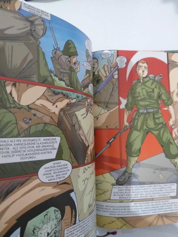 24X16 SAYFA, ÇANAKKALE DESTANI ÇİZGİ ROMANLARI: 1-ÇANAKKALE GEÇİLMEZ, 2-......, 3-MESUDİYE ZIRHLISI, 4-KOCA SEYİT, 5-YAHYA ÇAVUŞ, 6-CONKBAYIRI, 7-57.ALAY, 8-KAZANDIĞIMIZ AN, 9-O KOMUTAN BENİM, 10-ALEKO, 11-KINALI ALİ, 12-MEHMET MUZAFFER, 13-FIRINCI ALİ, 14-GÜL GELİNCİL, KURTULUŞ SAVAŞI DESTAN: GAZİ KOVAN + 1-NENE HATUN, 3-ONBAŞI NEZAHAT, TÜM FASİKÜLLER TEK CİLTTE TOPLANMIŞ, İLK FASİKÜLÜN UCUNDA HAFİF KIRILMA VAR, SAYFA SIRTLARINDA MATBAA KESİMİ YAPILMIŞ BAZI SAYFALARDA KESİM İÇE KAYMIŞ, BAZI YERLERDE SAYFA NUMARALARINI YUTMUŞ, GENEL OLARAK TEMİZ VE SAĞLIKLI.