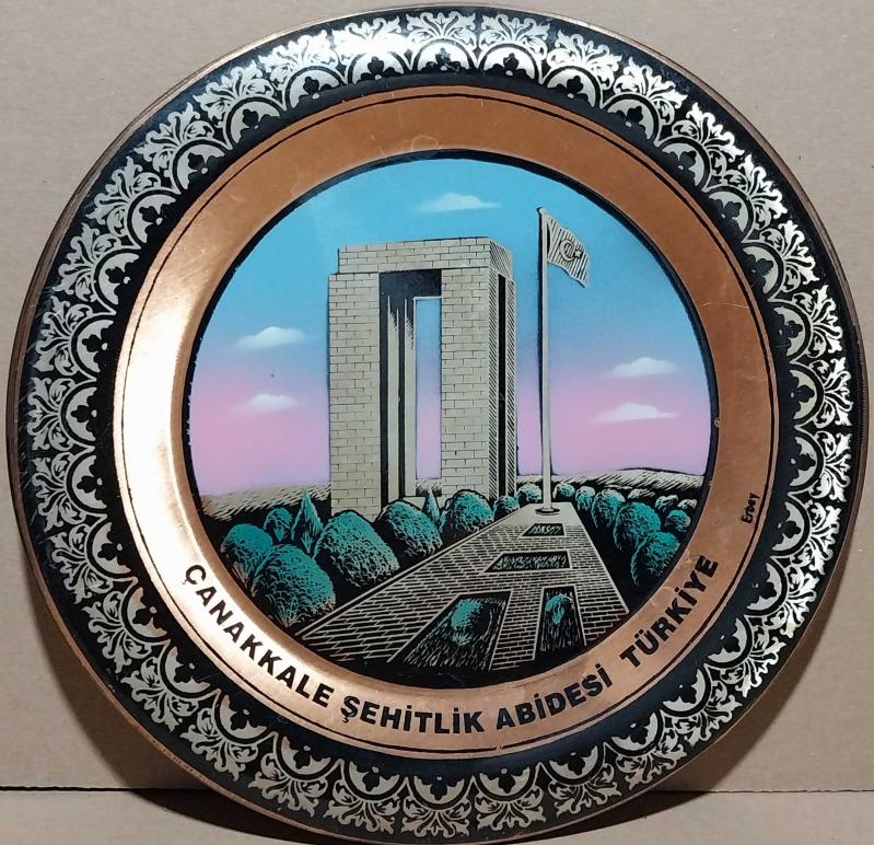 ÇANAKKALE ŞEHİTLER ABİDESİ TÜRKİYE 24 CM ÇAPINDA BAKIR METAL DUVAR SÜS TABAGI başlıklı antika/koleksiyon objesi Türkiye menşe’lidir. 1950-1999 arası dönemine aittir.