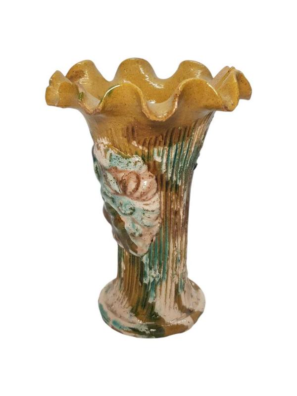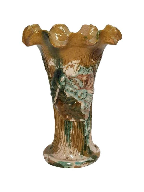 1930-1940'LARDAN ÇANAKKALE İŞİ PİŞMİŞ TOPRAK ÜZERİ SIRLI VE EL BOYAMA ROZETLİ (ÇİÇEKLİ) VAZO. YÜKSEKLİK: 16,5 CM