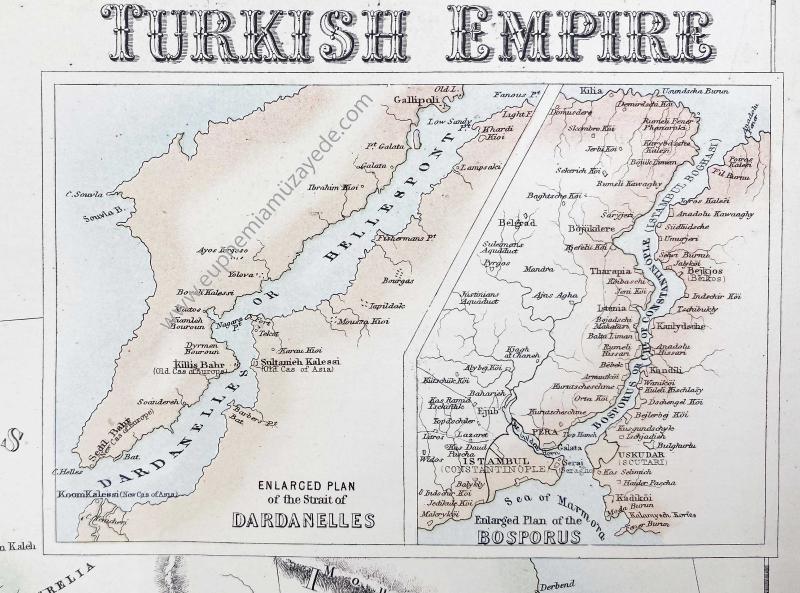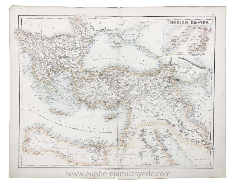Turkish Empire, A. Fullarton & Co, Edinburgh, London & Dublin, 1872. 1. Continuation of Map Part of Upper Egypt 2. Enlarged Plan of the Strait of Dardanelles 3. Enlarged Plan of the Bosporus. Royal Illustrated Atlas isimli eserden çıkmadır, 51 numaralı haritadır. Archibald Fullarton and Co., 1800'lerde İskoçya'nın Glasgow şehrinde faaliyet gösteren öncü bir kartograf ve harita ve atlas yayıncısıydı. Osmanlı Devletinin 1854 Yılında Üç Kıtadaki Topraklarını Gösteren Harita, Mısır topraklarının devamı, İstanbul ve Çanakkale Boğazları da harita üzerinde büyütülerek gösterilmiştir. Osmanlı Devletinin Rumeli topraklarında Bosna, Sırbistan, Bulgaristan, Romanya, Arnavutluk; Anadolu'da Karaman, Adana, Maraş, Trabzon, Erzurum, Sivas, Erzurum, Maraş, Urfa, Halep, Diyarbakır ; Kuzey Afrika'da Trablusgarp ve Mısır; Arap Yarımadası'nda Filistin, Suriye, Bağdat görülmektedir. Kıbrıs, Girit adaları görülmektedir. Komşu ülkeler Avusturya, Rusya, Gürcistan, Kirmanşah, Luristan, Arabistan. Kenarları altın yaldızlıdır, 58x48 cm, kat yerinde yırtılma mevcut, harici çok temizdir.