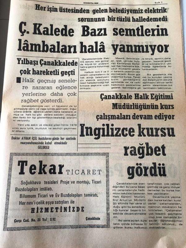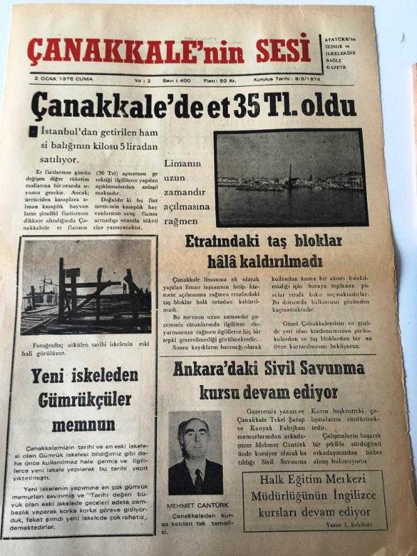 ÇANAKKKALE ÇANAKKALE 'NİN SESİ GAZETESİ YEREL TAŞRA BASINI -- 2 OCAK 1976 YIL :2 SAYI :400- Çanakkale 'de et 35 tl oldu -Ankara da Sivil Savunma Kursu Devam Ediyor - Onun Romanı Edebi Roman Yazan : Nihat Özbilen - ŞİİR Derleyen :M. ALİ Şahin - İş Başında : Faruk Nafız Çamlıbel -Çanakkale de Bazı Semtlerin Lambaları Hala Yanmıyor - Çanakkale Halk Eğitimi Müdürlüğünün Kurs Çalışmalarını Devam Ediyor İngilizce kursu rağbet gördü - Yüzmede 1975 'in dikkati çeken isimleri özün kardeşler - Küçüklerin başarısı büyükleri geride bıraktı - Kayakta Balkan Üçüncüsü Olduk - Kocaeli Spor da gergin hava düzelmeğe başladı Sabri Kiraz Ve Dört Yönetici İstifalarını Geri Aldılar - Yıpranma, sararmalar, kupon kesiği ve yırtılmalar zamana bağlı olarak görülebilir.