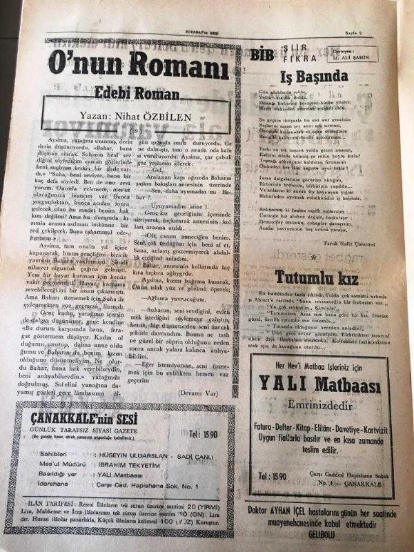 ÇANAKKKALE ÇANAKKALE 'NİN SESİ GAZETESİ YEREL TAŞRA BASINI -- 2 OCAK 1976 YIL :2 SAYI :400- Çanakkale 'de et 35 tl oldu -Ankara da Sivil Savunma Kursu Devam Ediyor - Onun Romanı Edebi Roman Yazan : Nihat Özbilen - ŞİİR Derleyen :M. ALİ Şahin - İş Başında : Faruk Nafız Çamlıbel -Çanakkale de Bazı Semtlerin Lambaları Hala Yanmıyor - Çanakkale Halk Eğitimi Müdürlüğünün Kurs Çalışmalarını Devam Ediyor İngilizce kursu rağbet gördü - Yüzmede 1975 'in dikkati çeken isimleri özün kardeşler - Küçüklerin başarısı büyükleri geride bıraktı - Kayakta Balkan Üçüncüsü Olduk - Kocaeli Spor da gergin hava düzelmeğe başladı Sabri Kiraz Ve Dört Yönetici İstifalarını Geri Aldılar -, HÜSEYİN ULUARSLAN tarafından kaleme alınmıştır. Kitap 1974 yılında [YALI MATBAA ] yayınlanmıştır. 4 sayfadır. ÇANAKKKALE ÇANAKKALE 'NİN SESİ GAZETESİ YEREL TAŞRA BASINI -- 2 OCAK 1976 YIL :2 SAYI :400- Çanakkale 'de et 35 tl oldu -Ankara da Sivil Savunma Kursu Devam Ediyor - Onun Romanı Edebi Roman Yazan : Nihat Özbilen - ŞİİR Derleyen :M. ALİ Şahin - İş Başında : Faruk Nafız Çamlıbel -Çanakkale de Bazı Semtlerin Lambaları Hala Yanmıyor - Çanakkale Halk Eğitimi Müdürlüğünün Kurs Çalışmalarını Devam Ediyor İngilizce kursu rağbet gördü - Yüzmede 1975 'in dikkati çeken isimleri özün kardeşler - Küçüklerin başarısı büyükleri geride bıraktı - Kayakta Balkan Üçüncüsü Olduk - Kocaeli Spor da gergin hava düzelmeğe başladı Sabri Kiraz Ve Dört Yönetici İstifalarını Geri Aldılar - adlı eser Türkçe dilindedir.