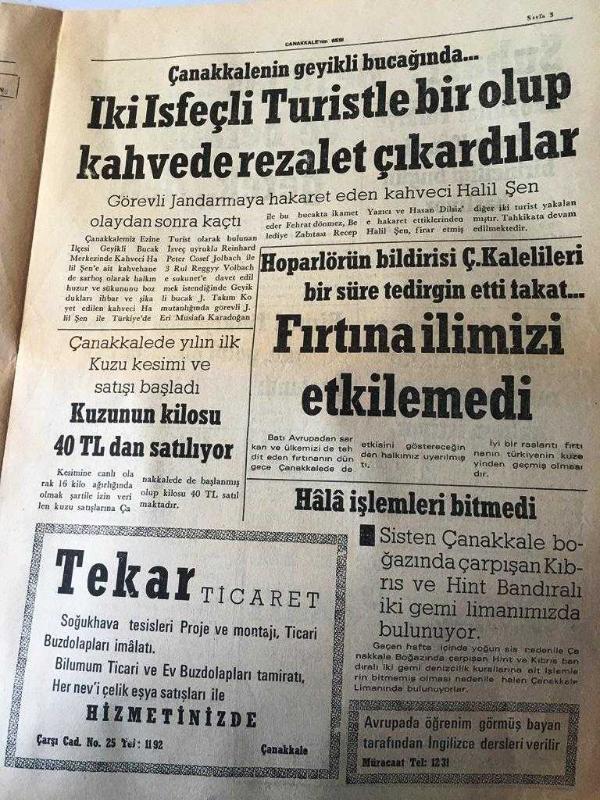 ÇANAKKKALE ÇANAKKALE 'NİN SESİ GAZETESİ YEREL TAŞRA BASINI - 7 OCAK 1976 YIL :2 SAYI :404- Çanakkale Verem Eğitim Ve Propaganda Haftası Başladı - Kayhan Yantıra 'nın Sağlık Durumu İyi - Yolcu Otobüsleri Yeterince Isıtılmıyor -Çanakkale de Esnaf Kontrolleri Devam Ediyor -Onun Romanı Yazan : Nihat Özbilen - Şiir :Belki Bir Gün : Ahmet Turp -Dünyanın En Küçük İnsanları -Çanakkale 'nin Geyikli Bucağında İki İsveçli Turistle Bir Olup Kahvede Rezalet Çıkardılar - Hoparlörün bildirisi Çanakkalelileri bir süre tedirgin etti -Çanakkale yılın ilk kuzu kesimi ve satışı başladı kuzunun kilosu 40 tl den satılıyor -Beşiktaş 'a birlik ve beraberlik gerek dedi - -Birinci Türkiye Ligi 'nde yeni yıla , gollü bir hafta ile başlandı - Trabzon Spor Pazar Gün kü Beşiktaş Maçı Otoriter Bir Hakem İstiyor - Yıpranma, sararmalar, kupon kesiği ve yırtılmalar zamana bağlı olarak görülebilir.