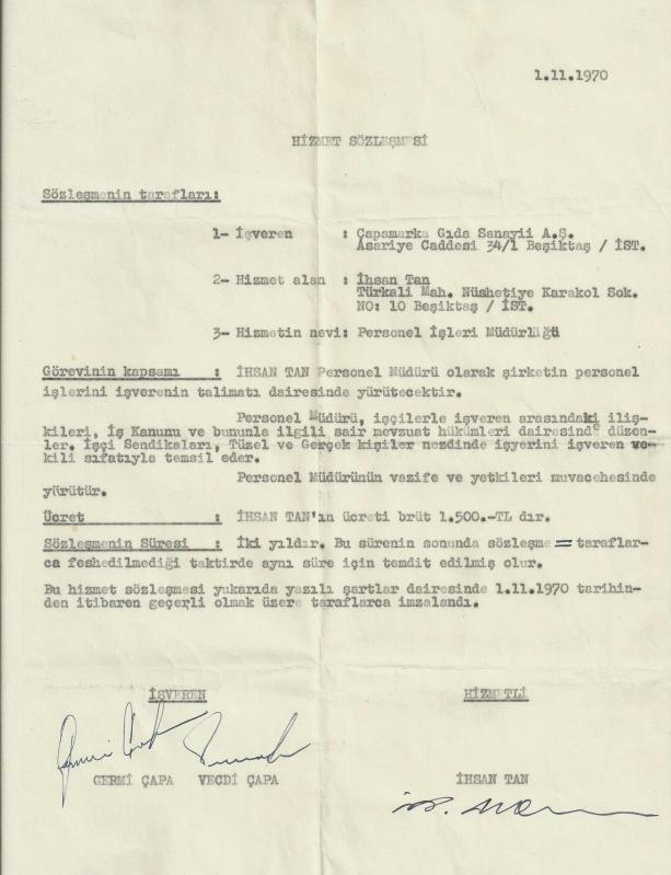 ** ÇAPAMARKA GIDA SANAYİİ A.Ş. POSTADAN GEÇMİŞ ISLAK İMZALI YAZIŞMA ** 1 Kasım 1970 tarihli, işveren konumunda olan Germi Çapa ve Vecdi Çapa ıslak imzalı, gayet iyi durumda,A4 ebadında bir sayfada hazırlanmış sözleşmedir..