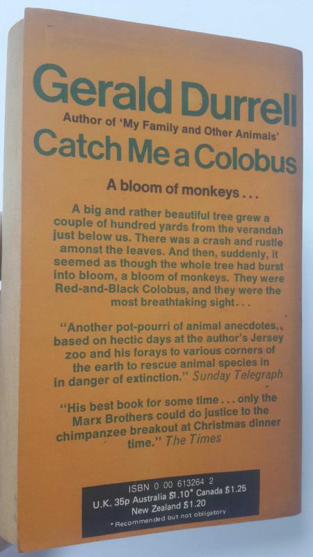 CATCH ME a COLOBUS ©1972 .. Gerald Malcolm Durrell .. (FONTANA / Continental Edition first issued 1973), GERALD DURRELL (1925-1995) tarafından kaleme alınmıştır. Kitap 1973 yılında FONTANA-Collins tarafından [GREAT BRITAIN] 0006132642 ISBN kodu ile yayınlanmıştır. Satışta olan kitap, yayınevinin 1. baskısıdır. Bu baskının çevirisi Drawings: Edward Mortelmans (1915-2008) tarafından yapılmıştır. 221 sayfadır. CATCH ME a COLOBUS ©1972 .. Gerald Malcolm Durrell .. (FONTANA / Continental Edition first issued 1973) adlı eser İngilizce dilindedir.
