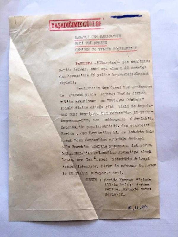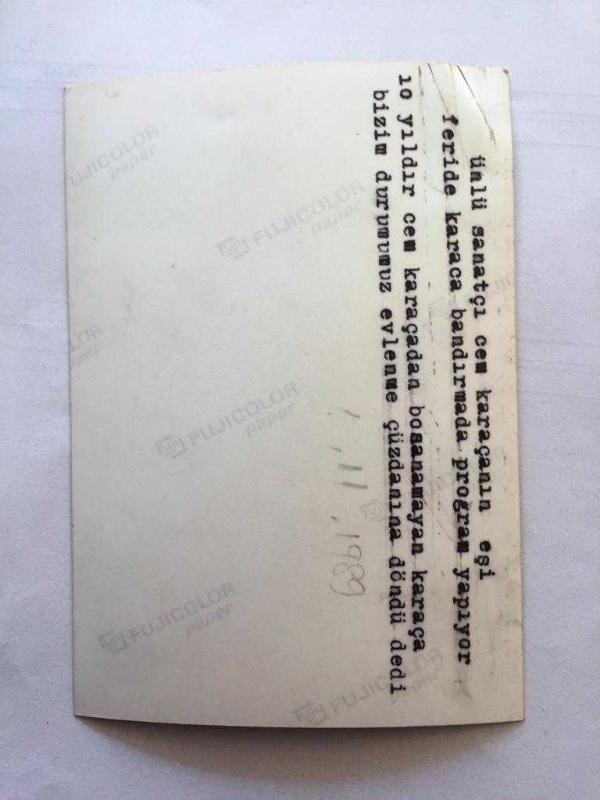 CEM KARACA'NIN ESKİ EŞİ FERİDE KARACA'NIN 2 ADET OTİJİNAL FOTOĞRAFI ve 1 ADET HABER METNİ - FOTOĞRAFLAR 12 x 9 cm ve HABER METNİ 20 x 14 cm EBADINDA - CEM KARACA'DAN 10 YILDIR BOŞANAMADIĞINI SÖYLEYEN FERİDE KARACA...10 KASIM 1989, en son 1 yıl önce güncellenmiştir.