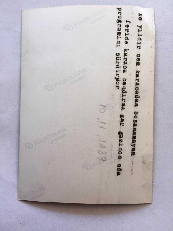 CEM KARACA'NIN ESKİ EŞİ FERİDE KARACA'NIN 2 ADET OTİJİNAL FOTOĞRAFI ve 1 ADET HABER METNİ - FOTOĞRAFLAR 12 x 9 cm ve HABER METNİ 20 x 14 cm EBADINDA - CEM KARACA'DAN 10 YILDIR BOŞANAMADIĞINI SÖYLEYEN FERİDE KARACA...10 KASIM 1989 başlıklı ürün, Efemera, Müzik, Sinema > Fotoğraflar > Müzik kategorisi altında İkinci El olarak satılmaktadır.