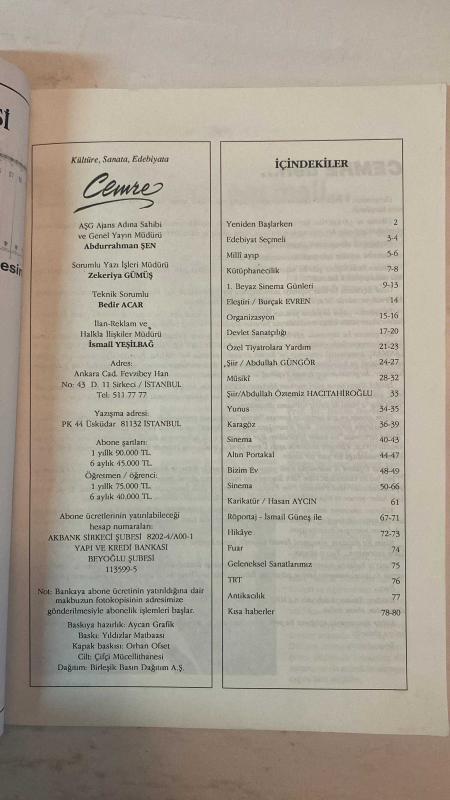 CEMRE KÜLTÜRE, SANATA, EDEBİYATA DERGİSİ - KASIM 1991 — SAYI: 5 ABDURRAHMAN ŞEN - ZEKERİYA GÜMÜŞ - BEDİR ACAR - İSMAİL YEŞİLBAĞ - BURÇAK EVREN - MESUT UÇAKAN - OSMAN KARA - MEHMET DOĞAN - FÜSUN SAYAN - MURAT ŞİMŞEK - ABDULLAH GÜNGÖR - ABDULLAH ÖZTEMİZ HACITAHİROĞLU YENİDEN BAŞLARKEN - EDEBİYAT SEÇMELİ - MİLLÎ AYIP: MEHMET ÂKİF’İN KIZI SUAT ERSOY’UN DRAMI - KÜTÜPHANECİLİK - 1. BEYAZ SİNEMA GÜNLERİ - BEYAZ SİNEMA VE TÜRK SİNEMASININ YENİDEN YAPILANMASI - ELEŞTİRİ / BURÇAK EVREN - DEVLET SANATÇILIĞI - ÖZEL TİYATROLARA YARDIM - ŞİİR / ABDULLAH GÜNGÖR - MÛSİKÎ - ŞİİR / ABDULLAH ÖZTEMİZ HACITAHİROĞLU - YUNUS - KARAGÖZ - BİZİM EV - SİNEMA - KARİKATÜR / HASAN AYCIN - RÖPORTAJ: İSMAİL GÜNEŞ - HİKÂYE - FUARLAR VE FESTİVALLER - GELENEKSEL SANATLAR - TRT - ANTİKACILIK - KISA HABERLER - TAM TAKIM EKSİKSİZ 66 SAYFA adlı eser, Kitap > Süreli Yayınlar > Dergiler > Magazin, Moda kategorisinde İkinci El olarak satıştadır.