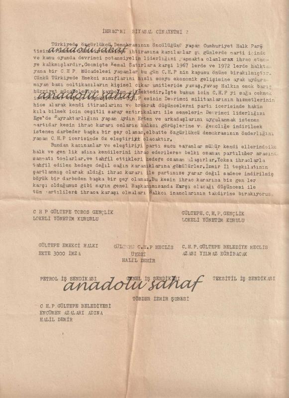 CHP Gültepe Toros Gençlik Lokeli Yönetim Kurulu, Gültepe Belediyesi, TÖBDER İzmir Şubesi, Teksitil İş Sendikası, Petrol ve Genel İş Sendikası İhrac mı Siyasal Cinayet mi? Başlıklı Bildiri ''Türkiyede özgürlükcü demokrasinin öncülüğünü yapan Cumhuriyet Halk Partisinin içinde iktidar olabilme ihtirasına kapılanlar şu günlerde parti içinde ve kamu oyunda devrimci potansiyelin liderliğini yapmakta olanları ihrac etmeye kalkmışlardır.'', 2 yıl önce satışa sunulmuştur.
