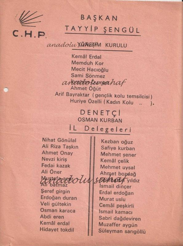CHP İl Başkanlığı Başkan Tayyip Şengül ve Yönetim Kurulu, İl Delegeleri Listesi [Cumhuriyet Halk Partisi Tarihi], en son 3 yıl önce güncellenmiştir.
