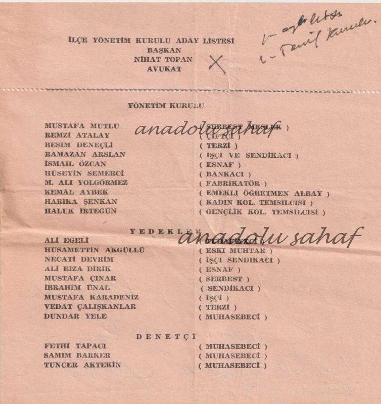 CHP İlçe Yönetim Kurulu Aday Listesi Başkan Nihat Topan ve Yönetim Kurulu, Yedekler, Denetçi Listesi [Cumhuriyet Halk Partisi Tarihi] başlıklı ürün, Efemera, Müzik, Sinema > Belge ve Evraklar > Türkçe Belgeler kategorisi altında İkinci El olarak satılmaktadır.