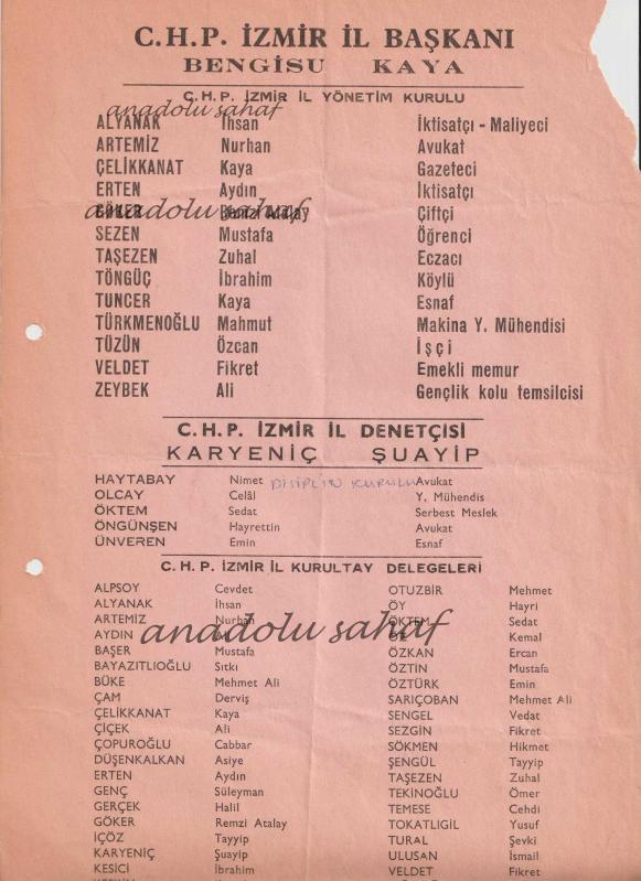CHP İzmir İl Başkanı Bengisu Kaya, İzmir İl Yönetim Kurulu ve İzmir Kurultay Delegeleri Aday Listesi [Cumhuriyet Halk Partisi Tarihi] başlıklı ürün, Efemera, Müzik, Sinema > Belge ve Evraklar > Türkçe Belgeler kategorisi altında İkinci El olarak satılmaktadır.