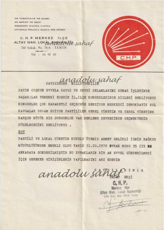 CHP İzmir Merkez İlçe Altay Mah. Lokal Başkanlığı Antetli, Başkan İmdat Ekşi İmzalı Evrak ''... Merkezci Demokratik Sol Kavgalar Devam Ediyor...'' [Cumhuriyet Halk Partisi Tarihi], en son 1 yıl önce güncellenmiştir.