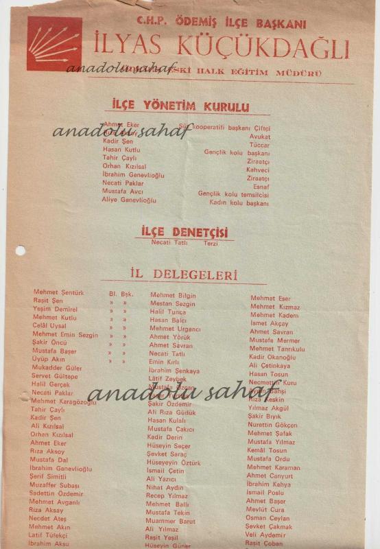 CHP İzmir Ödemiş İlçe Yönetim Kurulu Adayları ve İl Kongresi Delegeleri Adayları Listesi / Başkan: İlyas Küçükdağlı başlıklı ürün, Efemera, Müzik, Sinema > Belge ve Evraklar > Türkçe Belgeler kategorisi altında İkinci El olarak satılmaktadır.