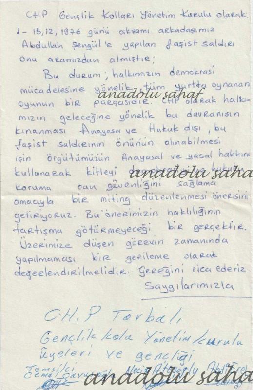 CHP İzmir Torbalı Gençlik Kolu Yönetim Kurulu Üyeleri ve Gençliği İmzalı El Yazı Bildiri, 1976 ve Çizim [Cumhuriyet Halk Partisi Tarihi], en son 1 yıl önce güncellenmiştir.
