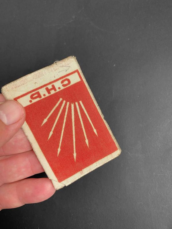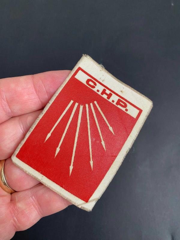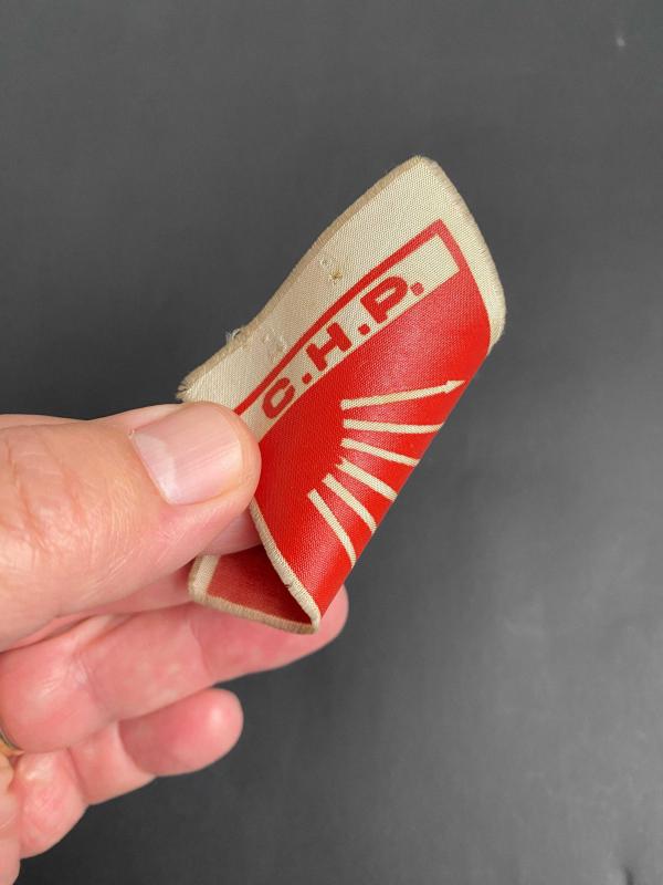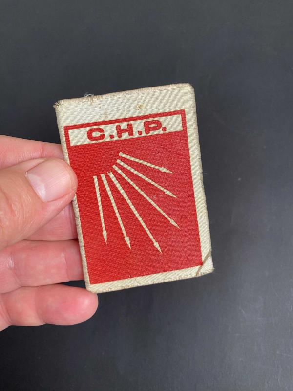 Koleksiyonluk 1950’li yıllardan bez CHP yaka kokartı… Cumhuriyet Halk Partisi yaka kokartı. CHP’nin siyasi parti logosu olan altı ok kırmızı zemin üzerine beyaz renkli olarak basılmış. CHP bez kokartı koleksiyonluk. . Ebat: 7,5 x 5 cm