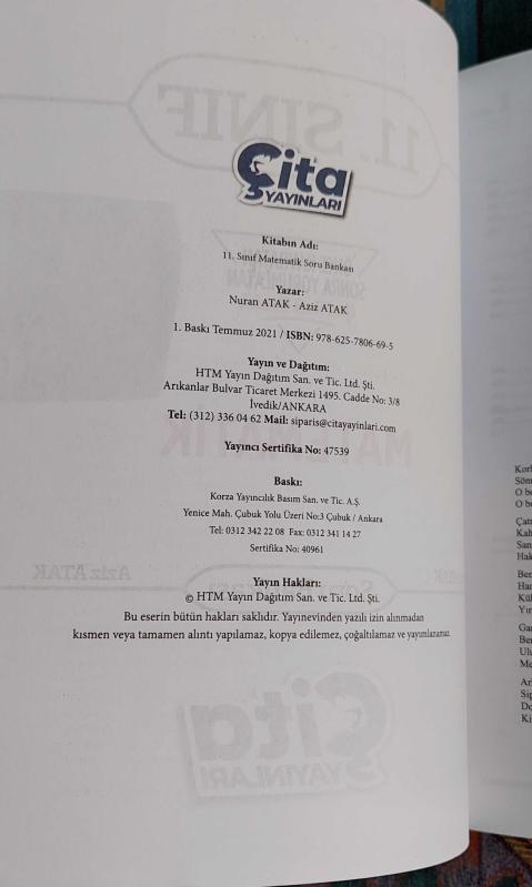 ÇİTA YAYINLARI, 11. SINIF MATEMATİK SORU BANKASI, NURAN ATAK - AZİZ ATAK tarafından kaleme alınmıştır. Kitap 2021 yılında ÇİTA YAYINLARI tarafından [ANKARA] yayınlanmıştır. Satışta olan kitap, yayınevinin 1. baskısıdır. 288 sayfadır. ÇİTA YAYINLARI, 11. SINIF MATEMATİK SORU BANKASI adlı eser Türkçe dilindedir.