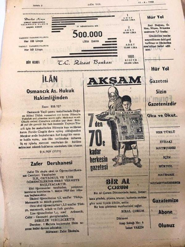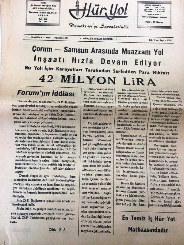 ÇORUM HÜR YOL GAZETESİ YEREL TAŞRA BASINI - 11 HAZİRAN 1959- YIL :5 SAYI :1009- Çorum -Samsun Arasında Muazzam Yol İnşaatı Hızla Devam Ediyor Bu Yol İçin Karayolları Tarafından Sarf edilen Para Miktarı 42 Milyon Lira- Forum 'un İddiası - İlan Osmancık As Hukuk Hakimliğinden - Yıpranma, sararmalar, kupon kesiği ve yırtılmalar zamana bağlı olarak görülebilir.