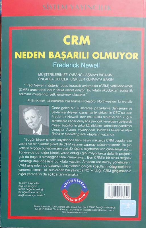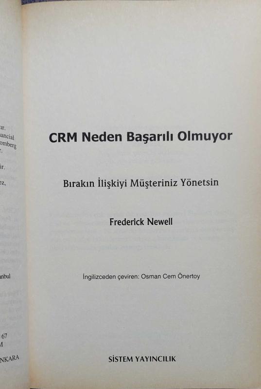 CRM NEDEN BAŞARILI OLMUYOR - BIRAKIN İLİŞKİYİ MÜŞTERİNİZ YÖNETSİN, FREDERİCK NEWELL tarafından kaleme alınmıştır. Kitap 2004 yılında SİSTEM YAYINCILIK tarafından [İSTANBUL] yayınlanmıştır. Satışta olan kitap, yayınevinin 1. baskısıdır. Bu baskının çevirisi OSMAN CEM ÖNERTOY tarafından yapılmıştır. 268 sayfadır. CRM NEDEN BAŞARILI OLMUYOR - BIRAKIN İLİŞKİYİ MÜŞTERİNİZ YÖNETSİN adlı eser Türkçe dilindedir.