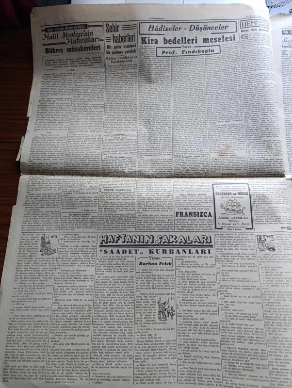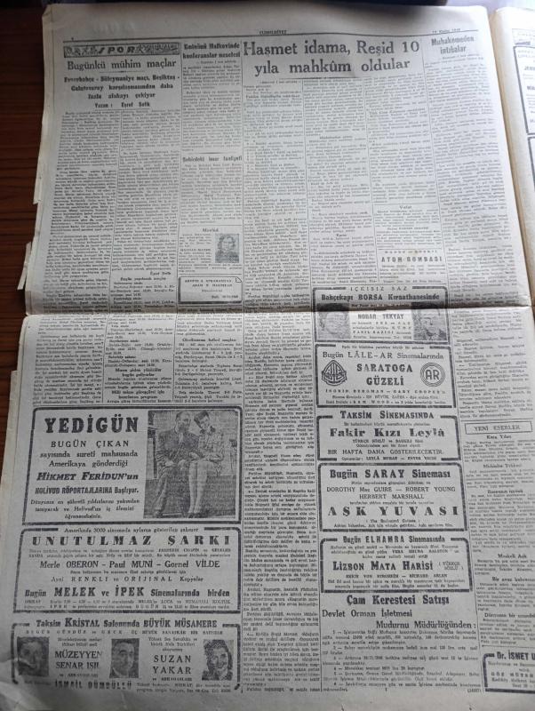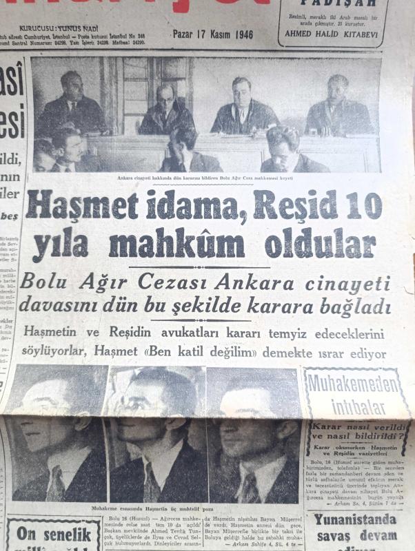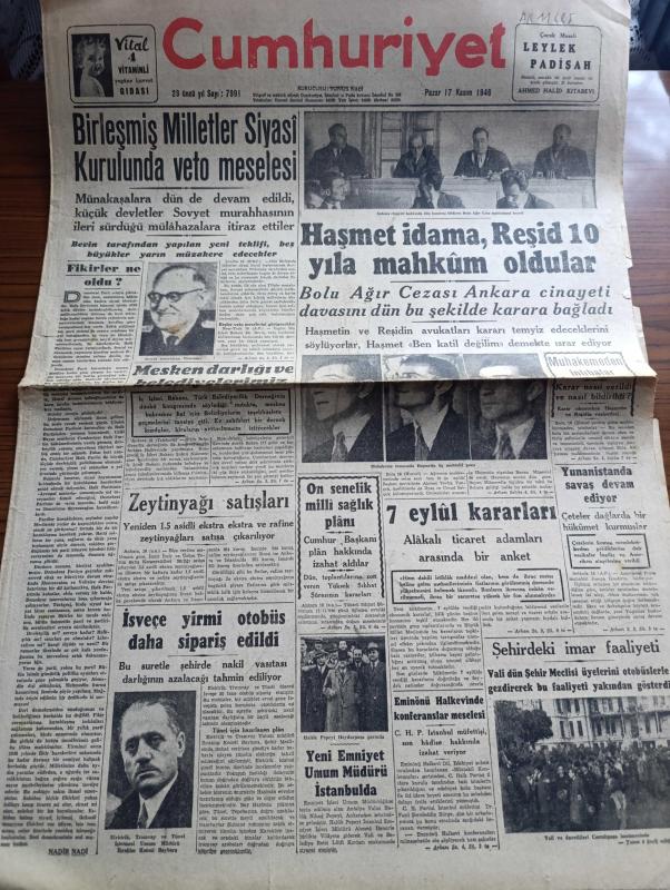 CUMHURİYET GAZETESİ - 17 KASIM 1946 - FİKİRLER NE OLDU YAZAN NADİR NADİ BAŞMAKALE - BİRLEŞMİŞ MİLLETLER SİYASİ KURULUNDA VETO MESELESİ - HAŞMET ORBAY İDAMA REŞİT MERCAN 10 YILA MAHKUM OLDULAR FOTOĞRAF - ANKARA CİNAYETİ HAKKINDA DÜN KARARINI BİLDİREN BOLU AĞIR CEZA MAHKEMESİ HEYETİ FOTOĞRAF - ON SENELİK MİLLİ SAĞLIK PLANI - ZEYTİNYAĞI SATIŞLARI - İSVEÇ'E YİRMİ OTOBÜS DAHA SİPARİŞ EDİLDİ - YUNANİSTAN'DA SAVAŞ DEVAM EDİYOR - YENİ EMNİYET UMUM MÜDÜRÜ HALUK PEPE İSTANBUL'DA FOTOĞRAF - HAFTANIN ŞAKALARI YAZAN BURHAN FELEK - ESKİ MECLİSİ MEBUSAN REİSİ HALİL MENTEŞE'NİN HATIRALARI YAZI DİZİSİ - YAVUZ SULTAN SELİM AĞLIYOR YAZAN FERİDUN FAZIL TÜLBENTÇİ YAZI DİZİSİ - ENDONEZYA HOLLANDA ANTLAŞMASI - GANDİ HASTALANDI - FAŞİSTLİK VE DEMOKRATLIK YAZAN ÖMER RIZA DOĞRUL - REİCHSTAG'I KİMİN YAKTIĞINI HİNDERBURG BİLİYORMUŞ - SARATOGA GÜZELİ BUGÜN LALE VE AR SİNEMALARINDA - FENERBAHÇE SÜLEYMANİYE MAÇI BEŞİKTAŞ GALATASARAY MAÇINDAN DAHA ÇOK DİKKAT ALAKA ÇEKİYOR - MÜZEYYEN SENAR IŞIL İSMAİL DÜMBÜLLÜ