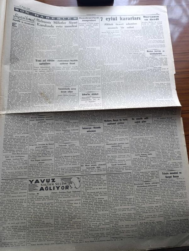 CUMHURİYET GAZETESİ - 17 KASIM 1946 - FİKİRLER NE OLDU YAZAN NADİR NADİ BAŞMAKALE - BİRLEŞMİŞ MİLLETLER SİYASİ KURULUNDA VETO MESELESİ - HAŞMET ORBAY İDAMA REŞİT MERCAN 10 YILA MAHKUM OLDULAR FOTOĞRAF - ANKARA CİNAYETİ HAKKINDA DÜN KARARINI BİLDİREN BOLU AĞIR CEZA MAHKEMESİ HEYETİ FOTOĞRAF - ON SENELİK MİLLİ SAĞLIK PLANI - ZEYTİNYAĞI SATIŞLARI - İSVEÇ'E YİRMİ OTOBÜS DAHA SİPARİŞ EDİLDİ - YUNANİSTAN'DA SAVAŞ DEVAM EDİYOR - YENİ EMNİYET UMUM MÜDÜRÜ HALUK PEPE İSTANBUL'DA FOTOĞRAF - HAFTANIN ŞAKALARI YAZAN BURHAN FELEK - ESKİ MECLİSİ MEBUSAN REİSİ HALİL MENTEŞE'NİN HATIRALARI YAZI DİZİSİ - YAVUZ SULTAN SELİM AĞLIYOR YAZAN FERİDUN FAZIL TÜLBENTÇİ YAZI DİZİSİ - ENDONEZYA HOLLANDA ANTLAŞMASI - GANDİ HASTALANDI - FAŞİSTLİK VE DEMOKRATLIK YAZAN ÖMER RIZA DOĞRUL - REİCHSTAG'I KİMİN YAKTIĞINI HİNDERBURG BİLİYORMUŞ - SARATOGA GÜZELİ BUGÜN LALE VE AR SİNEMALARINDA - FENERBAHÇE SÜLEYMANİYE MAÇI BEŞİKTAŞ GALATASARAY MAÇINDAN DAHA ÇOK DİKKAT ALAKA ÇEKİYOR - MÜZEYYEN SENAR IŞIL İSMAİL DÜMBÜLLÜ adlı eser, Kitap > Süreli Yayınlar > Gazeteler > Türkiye > Genel > Günlük kategorisinde İkinci El olarak satıştadır.