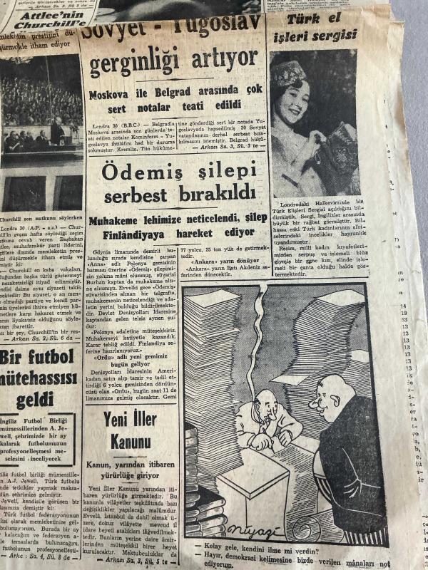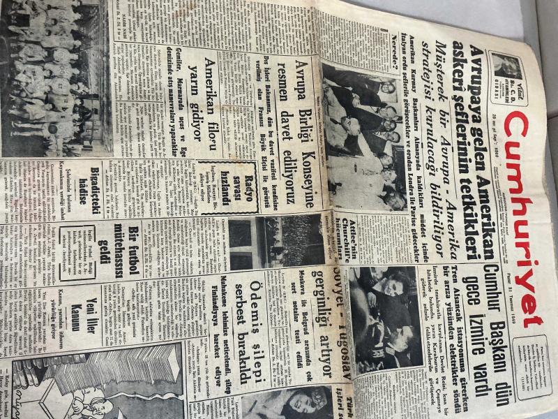 CUMHURİYET GAZETESİ -31 TEMMUZ 1949-CUMHUR BAŞKANI DÜN İZMİRE VARDI-YWNİ İLLER KANUNU-AMERİKAN FİLOSU YARIN GİDİYOR-AVRUPA BİRLİĞİ KONSEYİNE DAVET EDİLİYORUZ -TÜRK ELİŞLERİ SERGİSİ-ATOM BOMBASI VEYA SIRRI İNGİLTEREYE VERİLMELİMİDİR-DR FAHRİ CELAL-DR ŞEMSİ MUTVER-DOKTOR ZİYAEDDİN MAKTAV-ÜROLOG DOKTOR BAHAEDDİN LÜTFİ -DİŞ TABİBİ NECDET RIFAT ATAY -DR SEDAD KUMBARACILAR -, Münir Nureddin tarafından kaleme alınmıştır. CUMHURİYET GAZETESİ -31 TEMMUZ 1949-CUMHUR BAŞKANI DÜN İZMİRE VARDI-YWNİ İLLER KANUNU-AMERİKAN FİLOSU YARIN GİDİYOR-AVRUPA BİRLİĞİ KONSEYİNE DAVET EDİLİYORUZ -TÜRK ELİŞLERİ SERGİSİ-ATOM BOMBASI VEYA SIRRI İNGİLTEREYE VERİLMELİMİDİR-DR FAHRİ CELAL-DR ŞEMSİ MUTVER-DOKTOR ZİYAEDDİN MAKTAV-ÜROLOG DOKTOR BAHAEDDİN LÜTFİ -DİŞ TABİBİ NECDET RIFAT ATAY -DR SEDAD KUMBARACILAR - adlı eser Türkçe dilindedir.